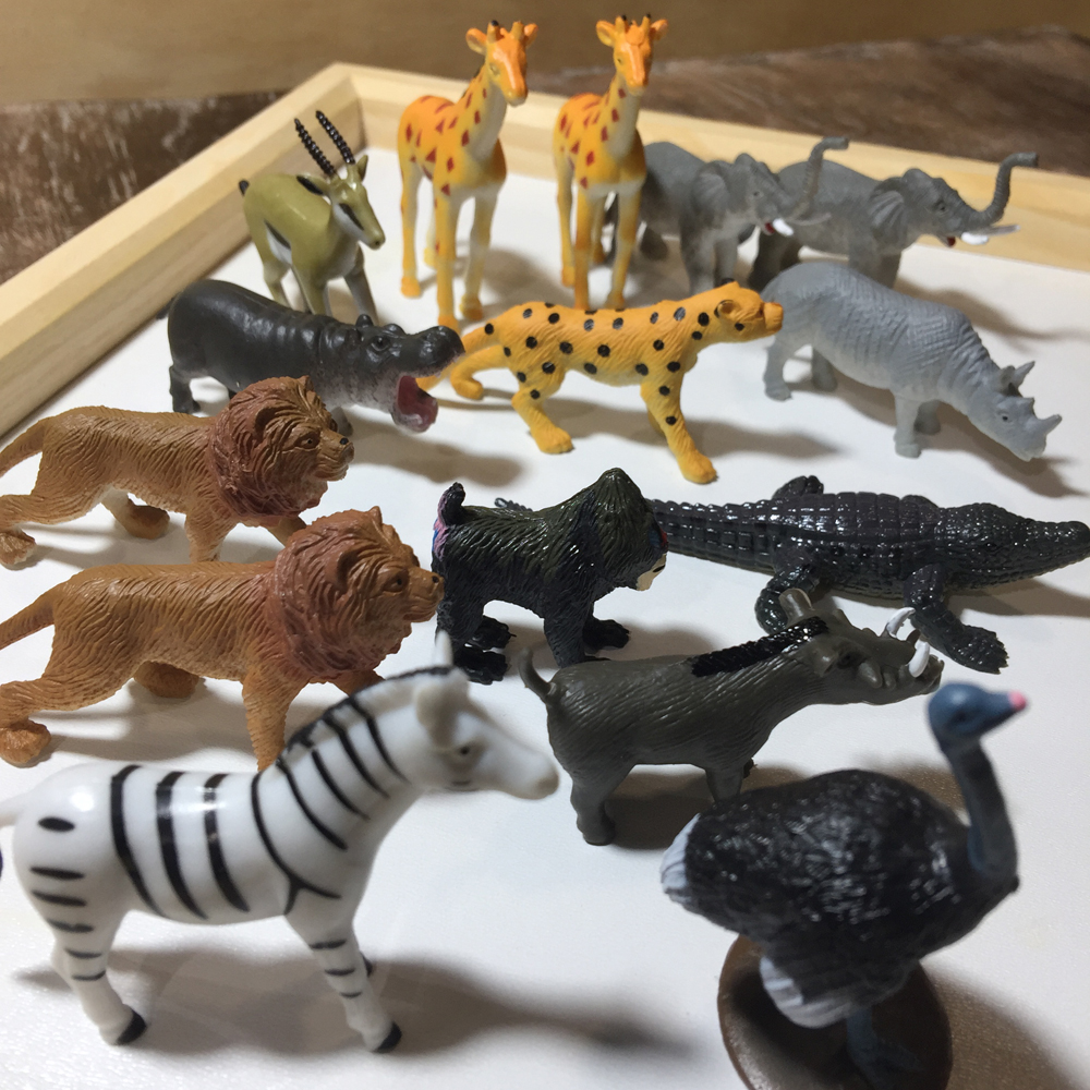 Contains: 2 x Giraffe, 2 x Elephant, 2 x Lion, 1 each Alligator, Zebra, Cheetah, Rhino, Warthog, Mandrill, Gazelle, Hippo and Cassowary
