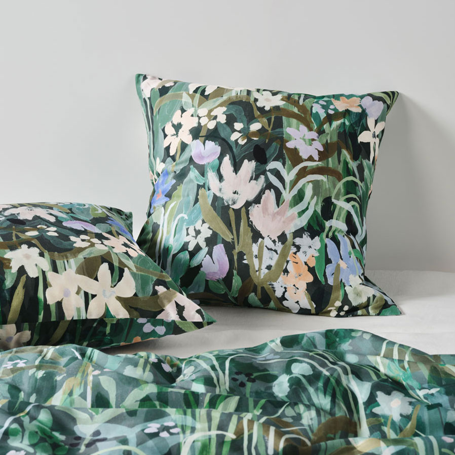 Layers of loosely painted flowers and leaves inspired by meadows of wildflowers in mauve, cornflower, and peach make Aubrey exude effortless style and warmth. Crafted from luxe cotton sateen, this floral design looks ravishing as a pair when adorned with its coordinating quilt cover set.