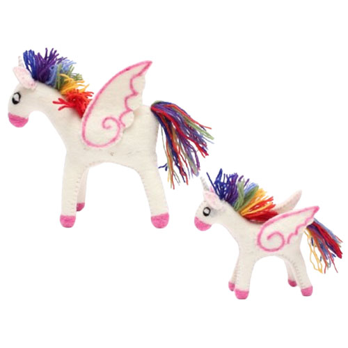 This mythical creature has been beautifully crafted from wool felt with a rainbow coloured main and tail, a silver spiral horn and magical wings to take off to Fairyland.