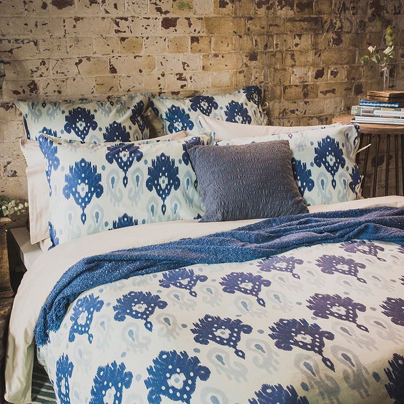 LAVINIA BLUE | Quilt Cover & Pillowcase Set Lavinia is a paisley ikat pattern printed on a beautiful linen cotton fabric. With shades of blue on a natural linen colour, this design is certain to make an eye-catching addition to the bedroom. The reverse of the quilt cover is 100% cotton and the blend of linen and cotton within the top fabric creates a lovely freshness as well as great washability, breathability and durability. Linen/Cotton Available in Quilt cover sets: Queen, King European pillowcase