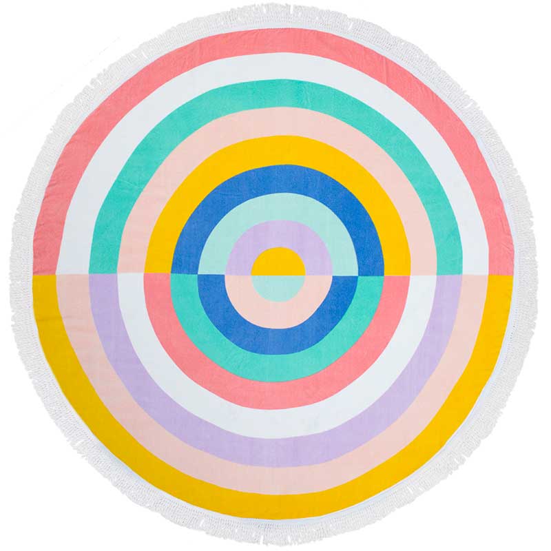 Bambury's latest beach towels are fun fashion prints perfect for summer! The Rainbow round beach towel features a fringe border and is printed on 100% soft cotton. The towel measures 150cm round. 100% soft cotton Fringe Round beach towel 150cm diameter Printed Velour Front Terry Towelling Reverse Other round beach towels by Bambury include Gypsy, Rainbow and Tulum.