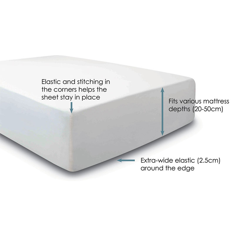 Finally, the fitted sheet that actually fits! fits a range of mattress depths (20-50cm), with elastic running down each corner extra-wide elastic around the edges 100% Cotton, 250 Thread Count Single, King Single, Double, Queen and King White, Silver, Cappuccino and Charcoal 1 fitted sheet per pack