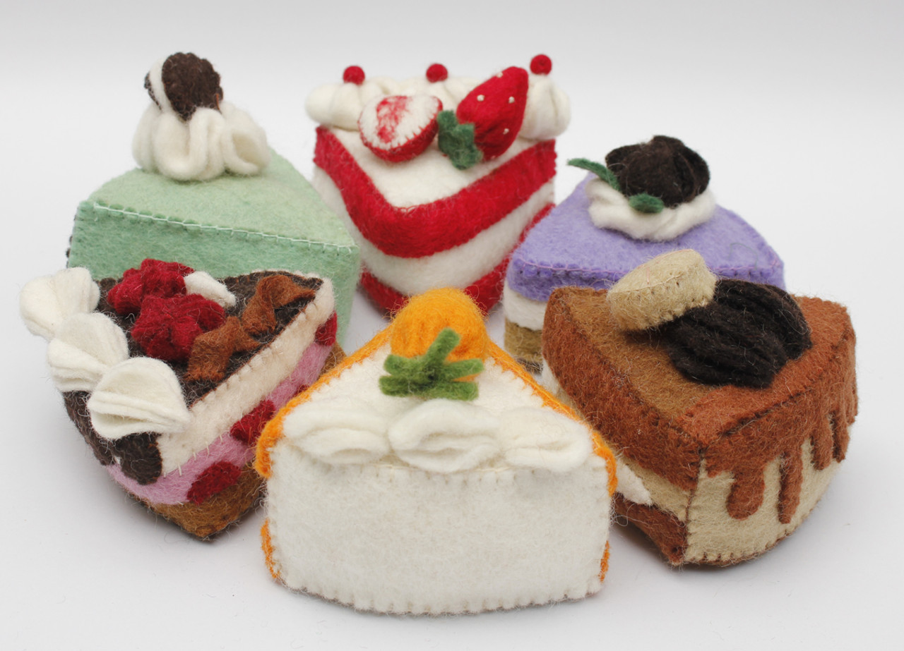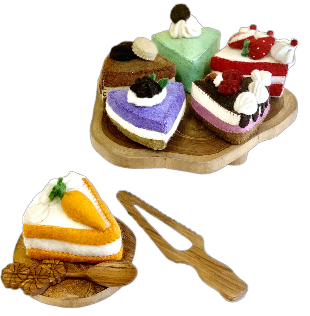 The cake is made up of six different cake slices perfect for sharing. Included in the set is the wood cake cutter. (serving boards not included, available separately)