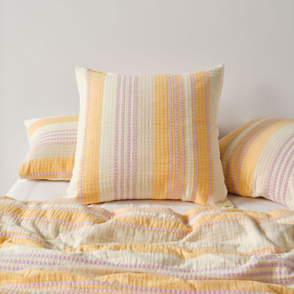 Designed to complement the Campbell Quilt Cover Set, this European pillowcase is sold individually for flexible styling. Featuring yarn-dyed stripes in mango and lilac hues, it is woven from soft, double-jacquard cotton for a beautiful drape and refined texture.