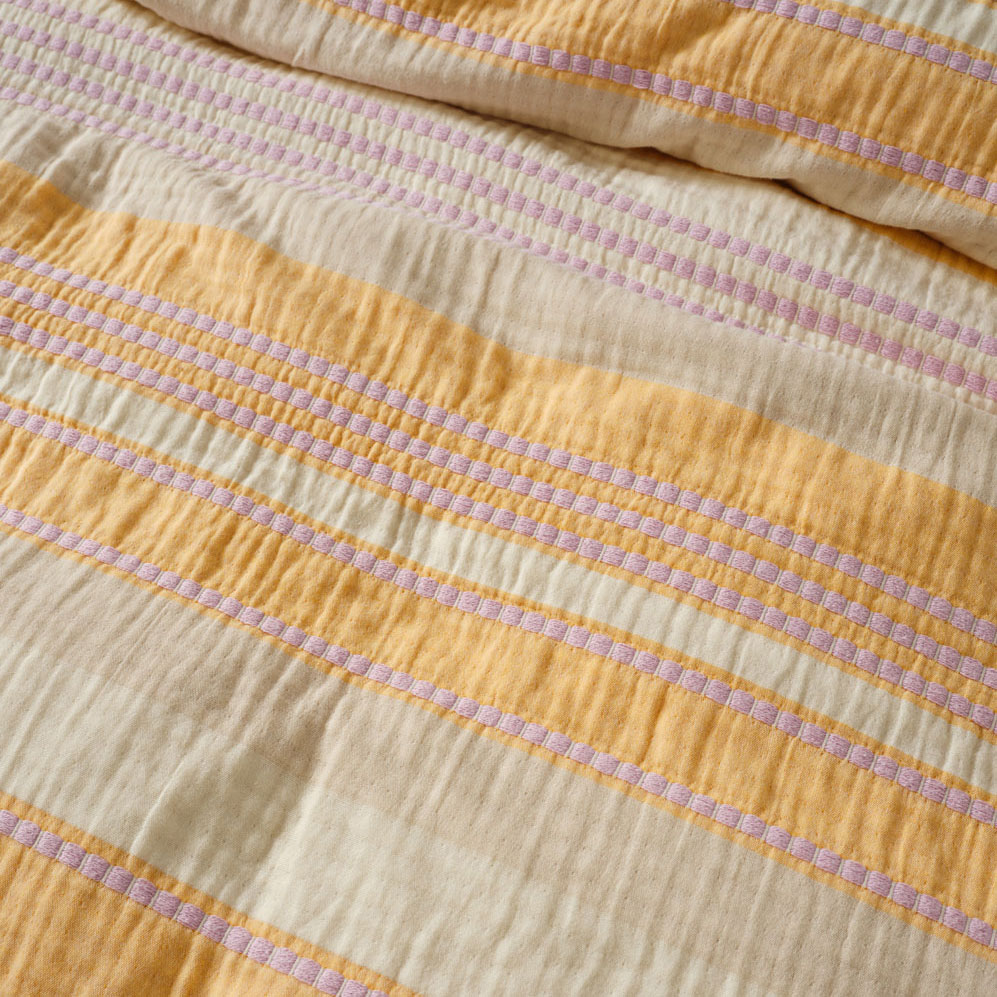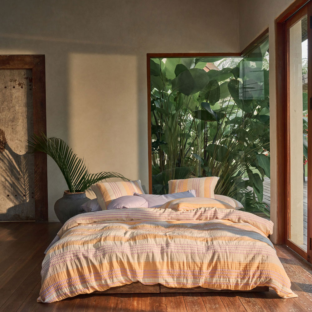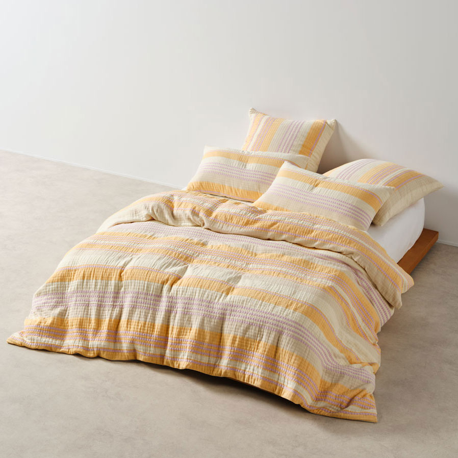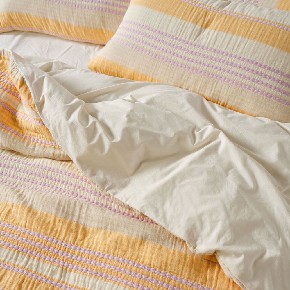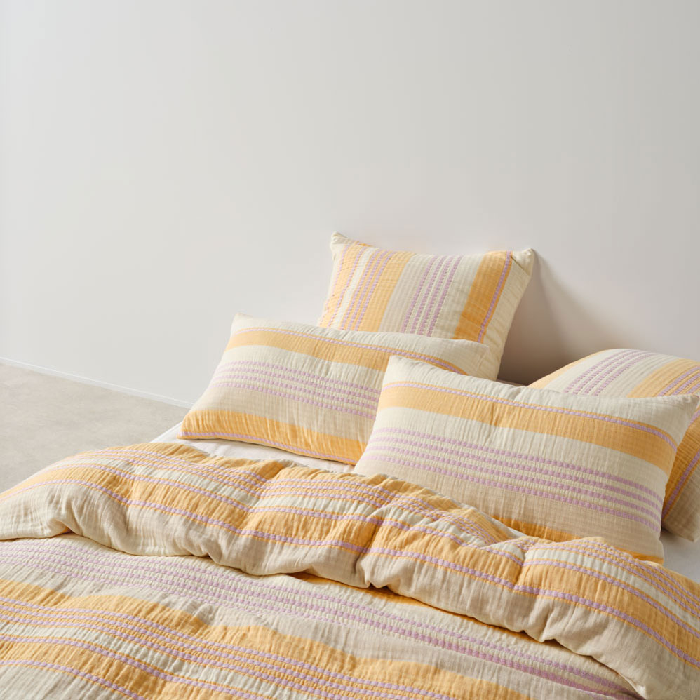 Campbell is a yarn-dyed, striped knockout that sings of summer. Its vibrant palette combines mango and lilac hues throughout, creating a lively yet refined aesthetic. Woven from soft, double-jacquard cotton, this quilt cover set offers the loveliest drape and enduring comfort.