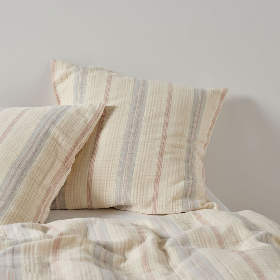Crafted to match the Coolum Quilt Cover Set, this European pillowcase is sold individually for versatile styling. Woven from double cotton jacquard, the yarn-dyed stripe in silver offers a refined, textural finish. Pair it with the quilt cover set for a serene and cohesive coastal-inspired look.