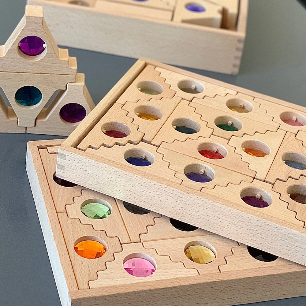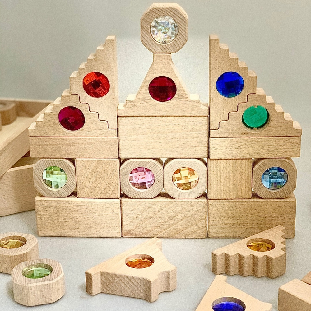 If you have ever been to the Netherlands, Amsterdam in particular, you may have noticed the amazing Dutch roof lines. These blocks are based on the shapes of the dutch roof lines and feature a see through gem secured in the wood.