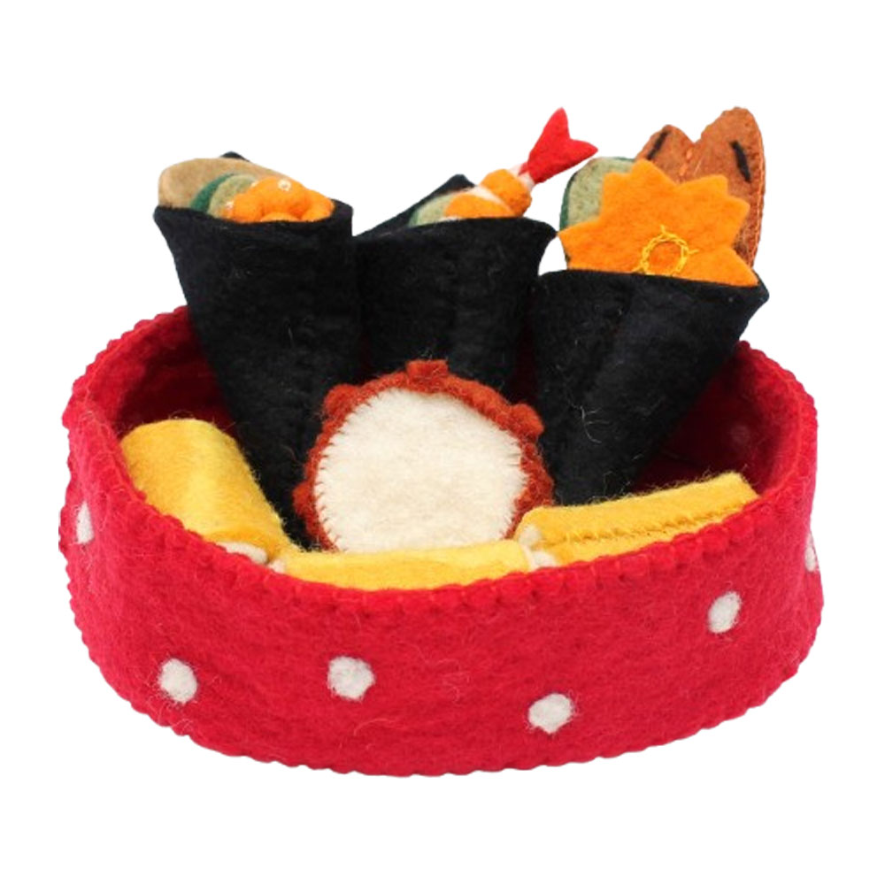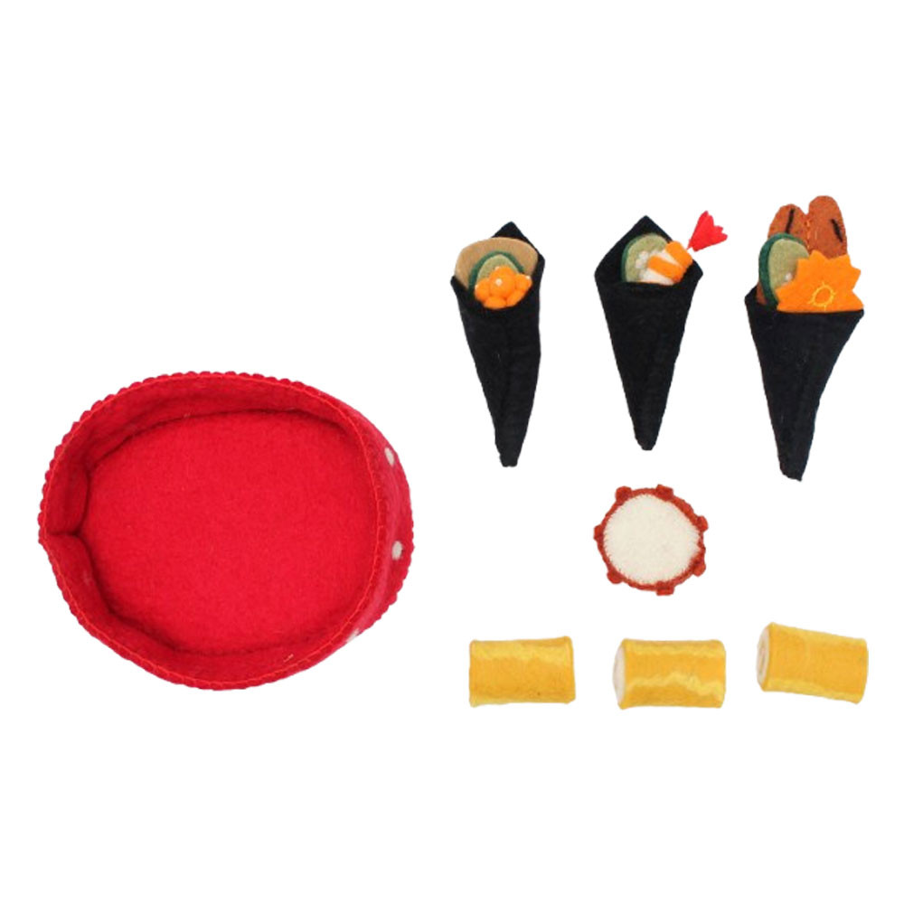 The red wool felt Oval bowl holds the Egg Rolls and the 3 sushi cones with interchangeable fillings.