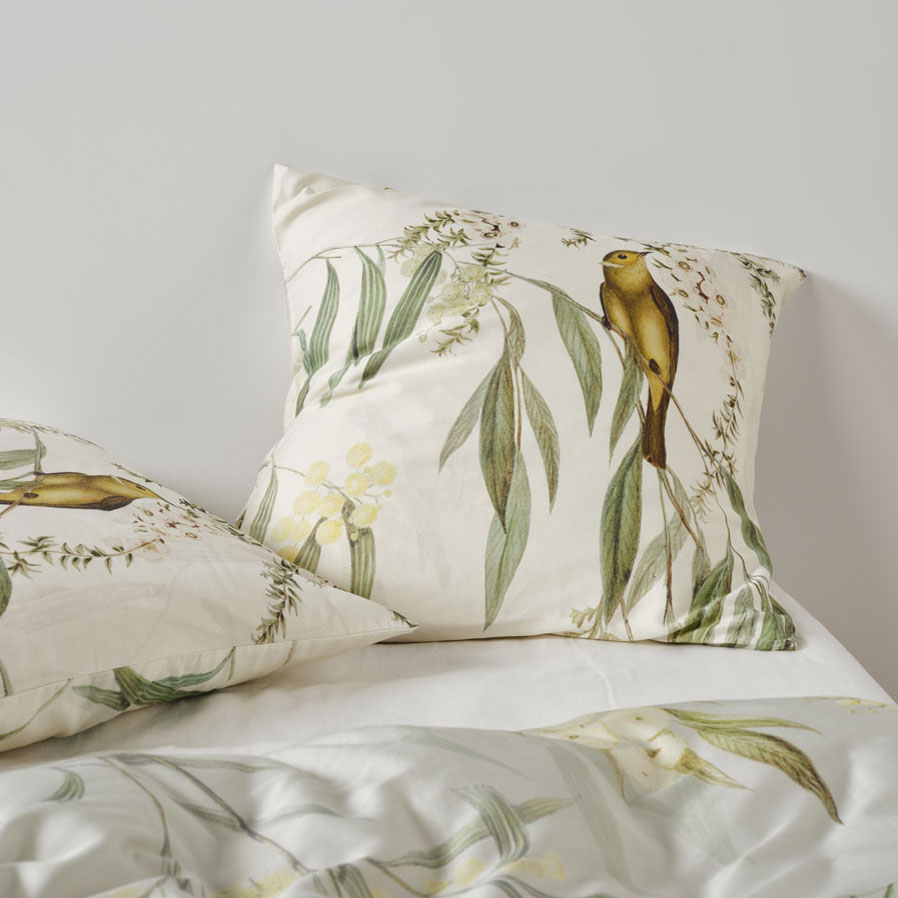 Complete your bedroom’s Australiana theme with the Linen House Eppalock European Pillowcase. Crafted from luxuriously soft cotton sateen, this botanical design showcases delicate wattle, flowering gum and native birds in a soothing palette of soft greens and neutral tones.