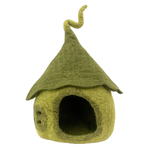 This large Fairy Moss Cave Set is handcrafted from wool and the detachable roof can be worn as a playful hat.