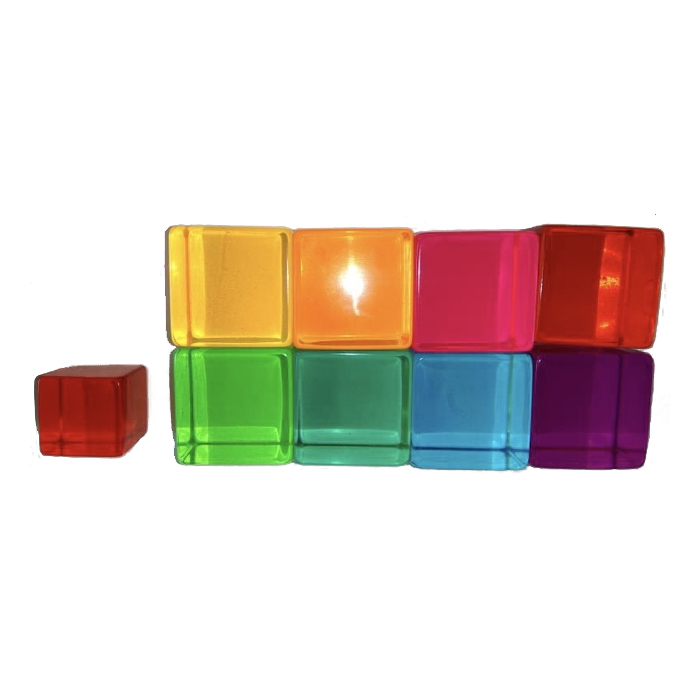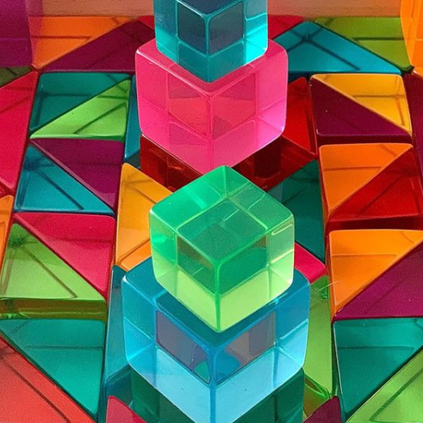 It is recommended NOT to let kids play with these items on hard surfaces like concrete. The pieces can chip when dropped on a very hard surface from a table top height. The Lucites are gorgeous and add a lot of play value and are excellent for teaching about colour and light reflections. They can be cleaned by wiping with a damp cloth.