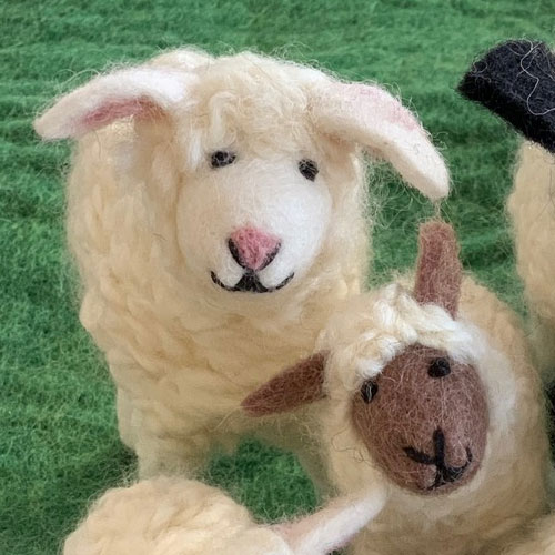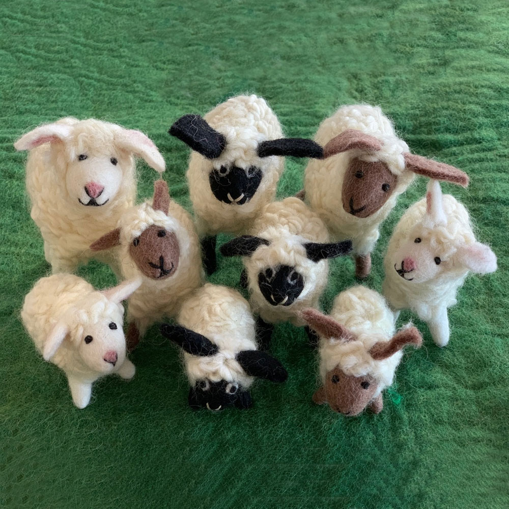 This flock of white, brown and black sheep features 3 large, 3 medium and 3 small sheep
