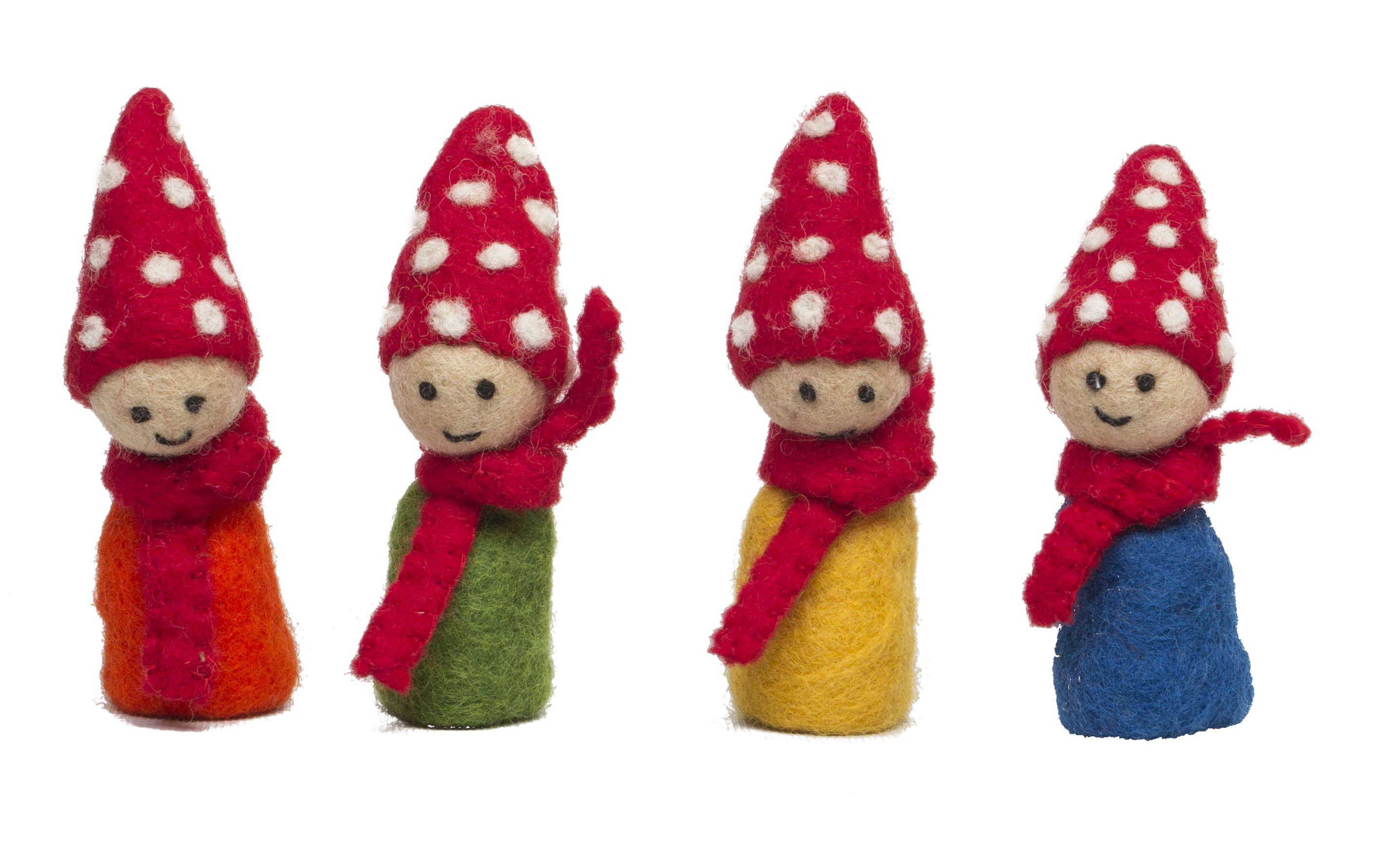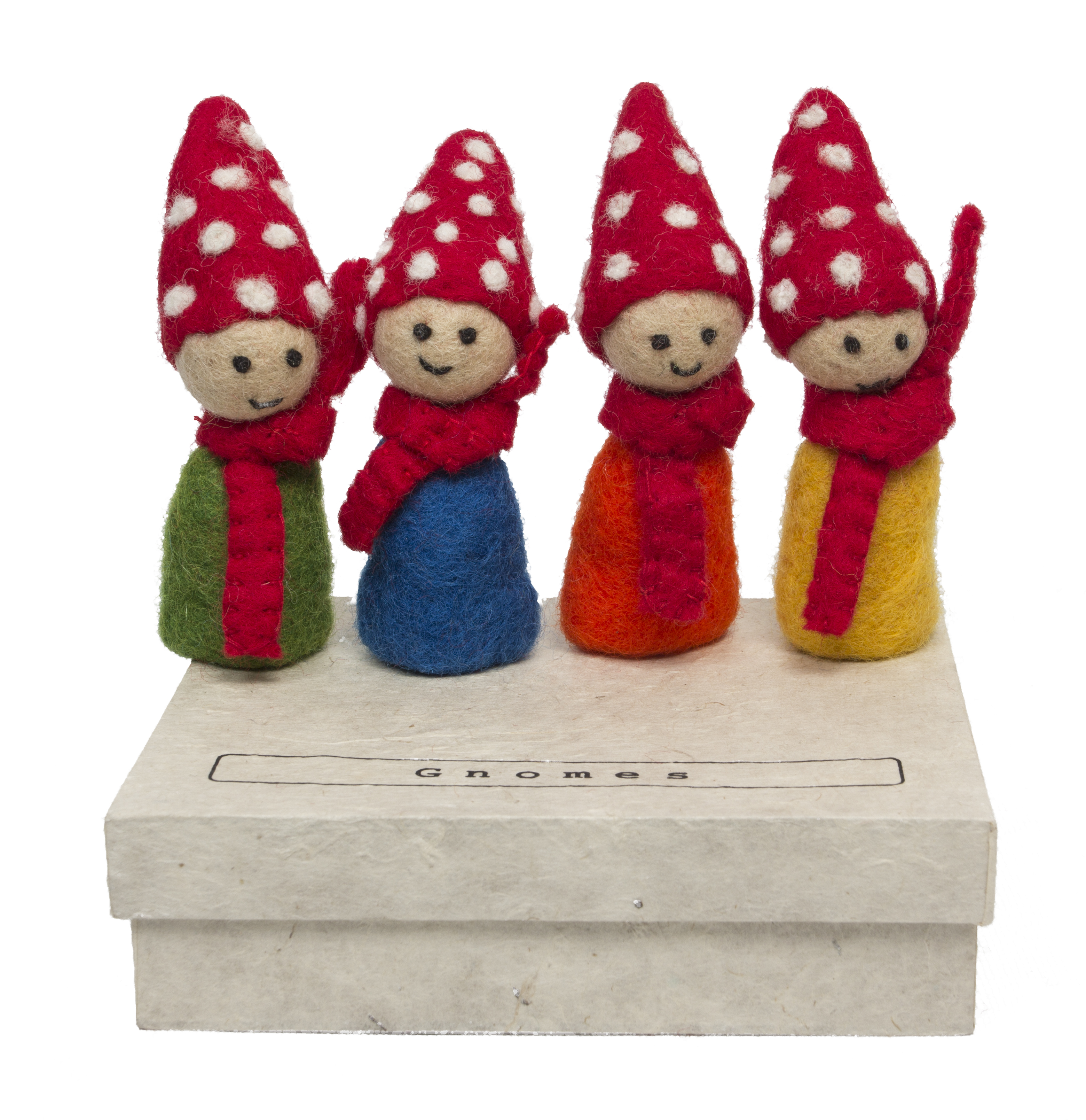 Wool felt finger puppets - Gnome characters packaged in a hand made cardboard box from recycled paper