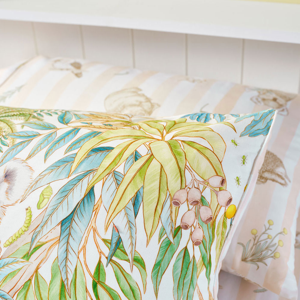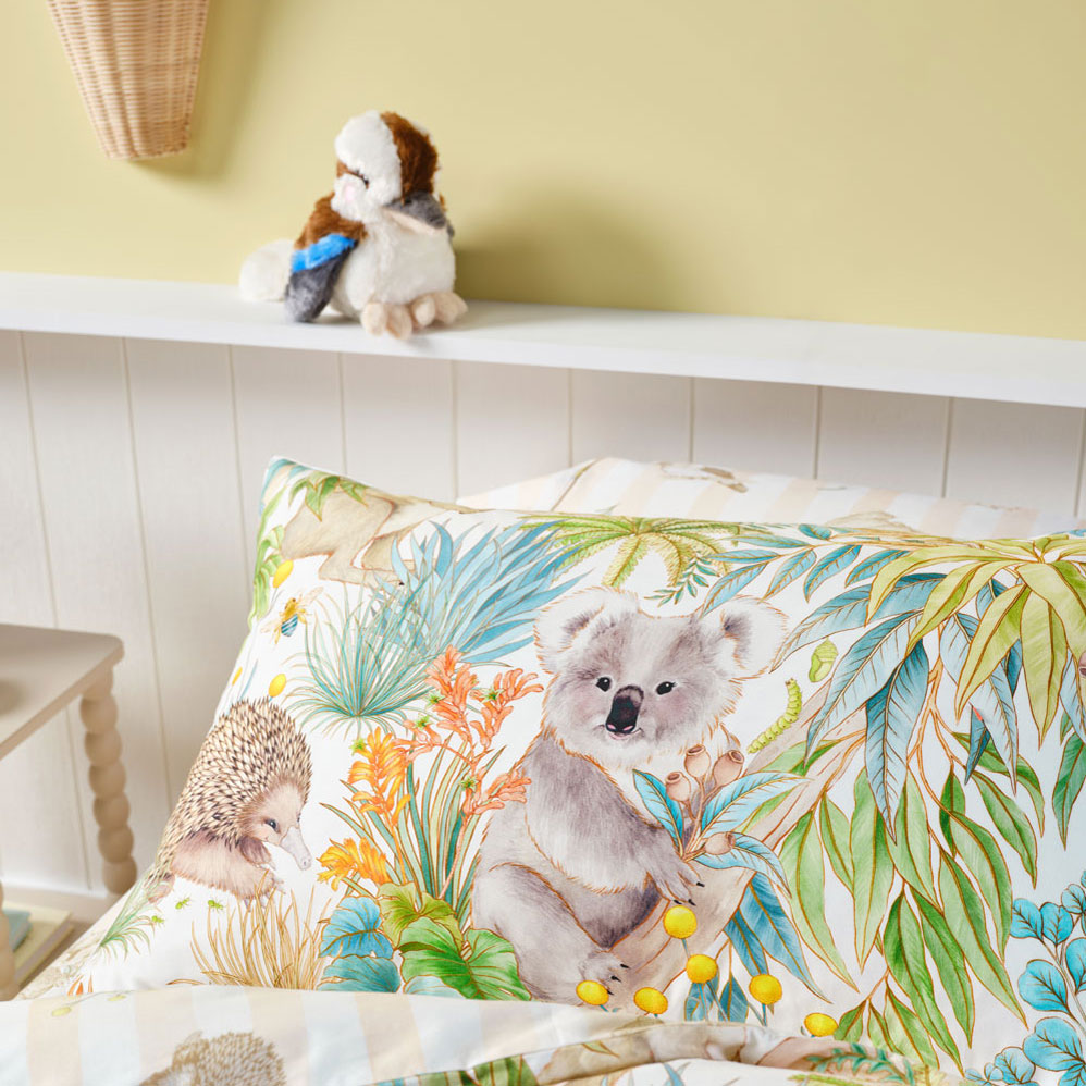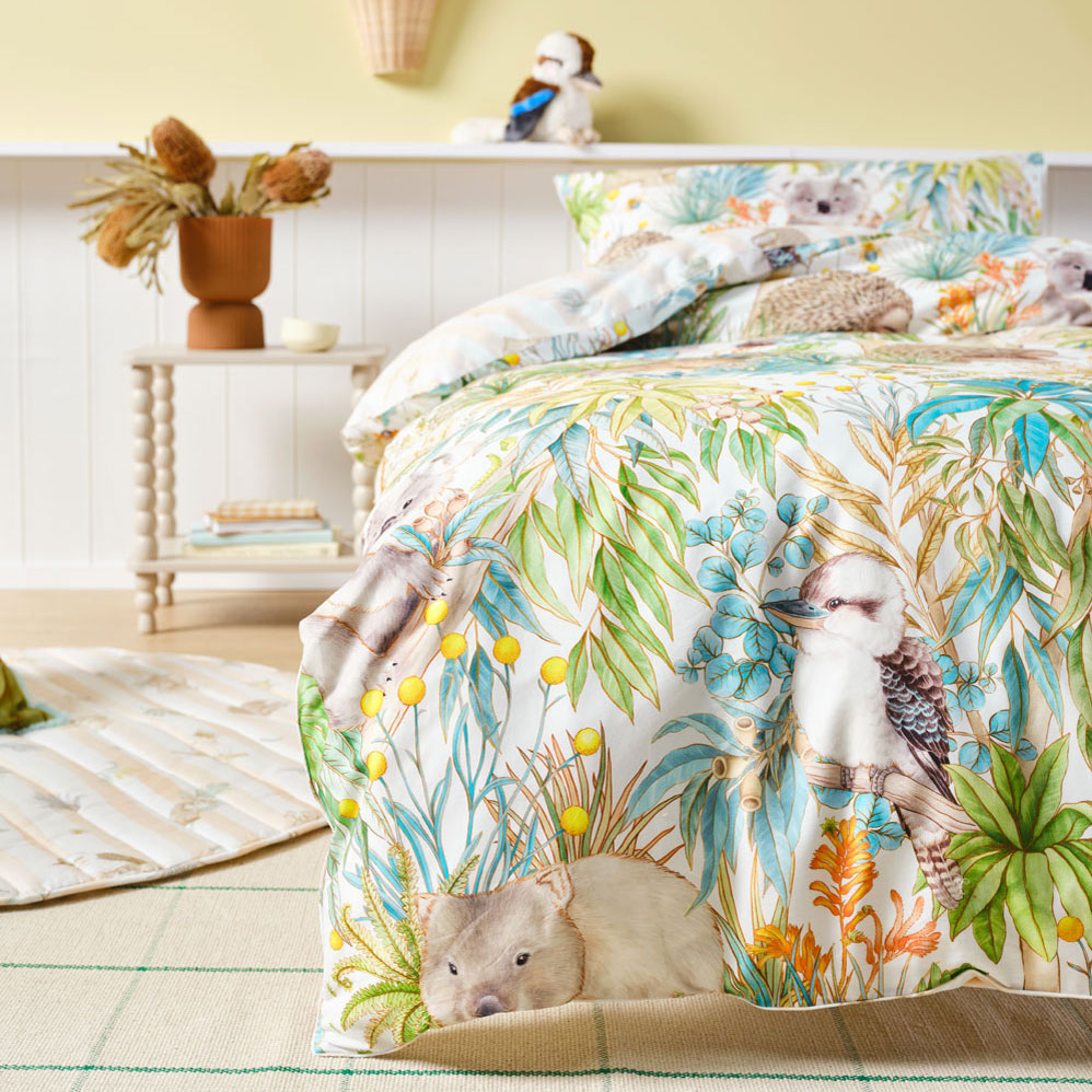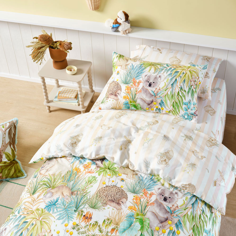 Crafted from breathable cotton percale and finished with cord piping, this quilt cover features a printed reverse for a second playful look. Pair it with Bush Walk sheet set and themed novelty cushions to complete the storybook scene.