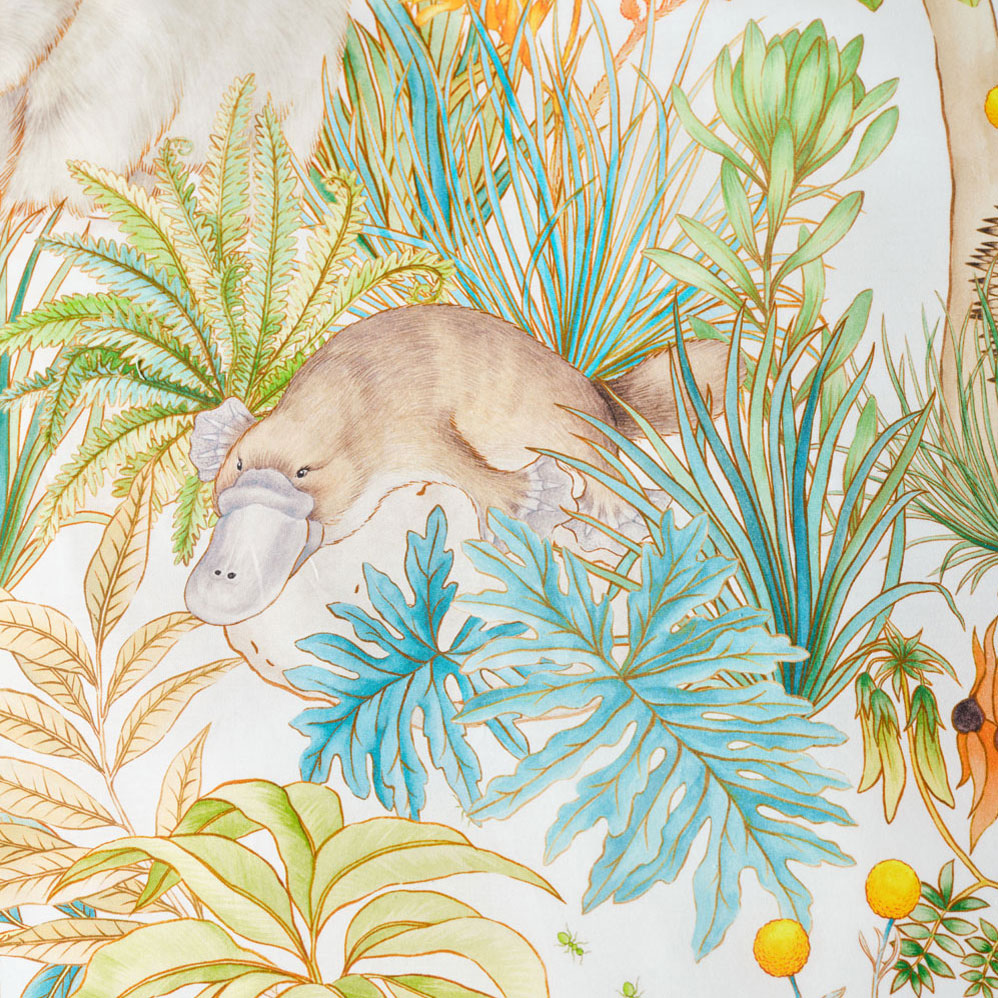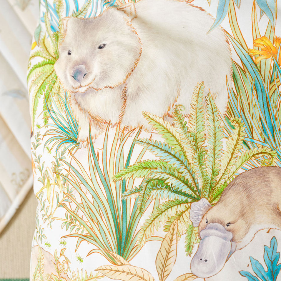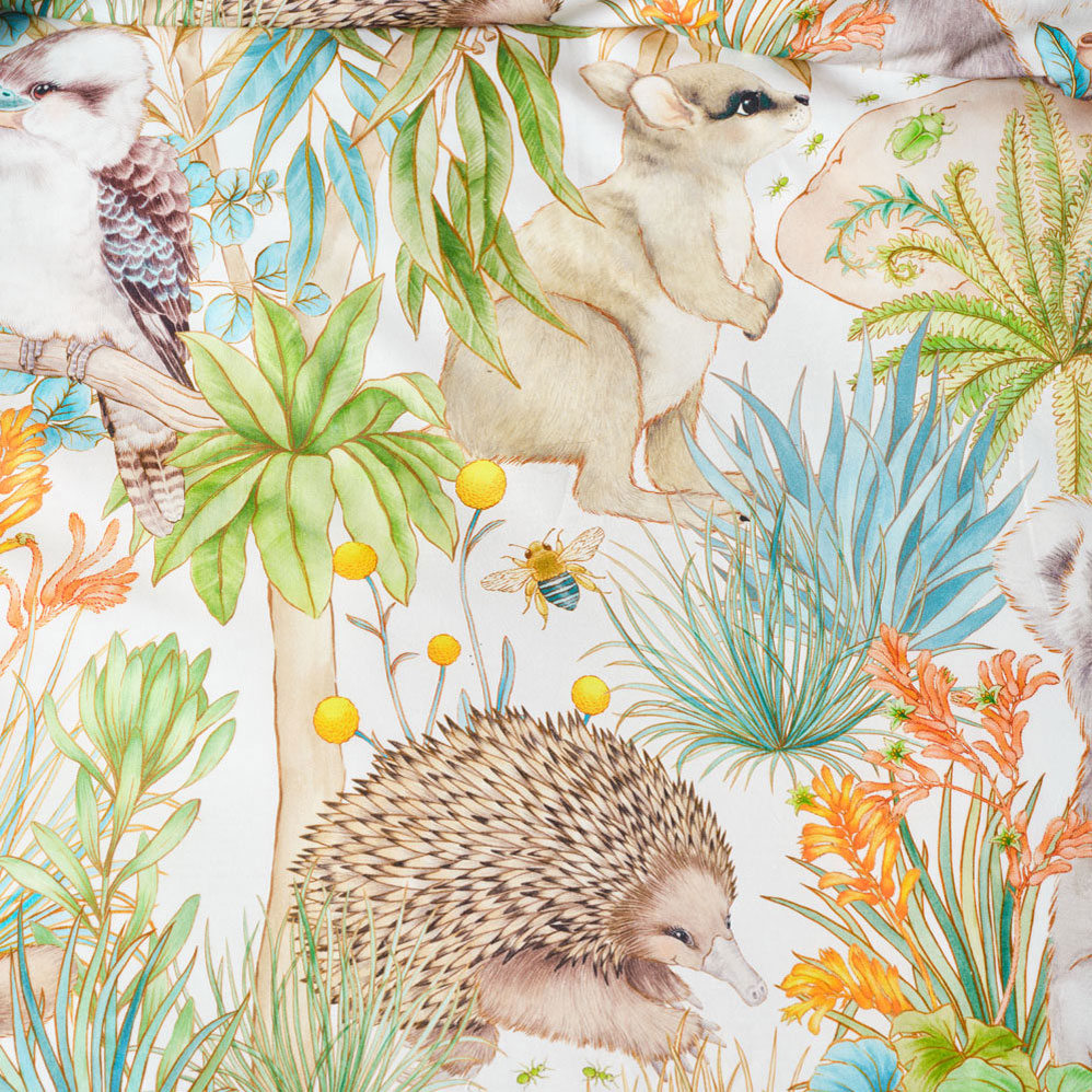 Inspired by the magic of the bush, this enchanting design invites little dreamers on a whimsical walk through Gum Leaf Gully. Look closely, koalas and kookaburras perch among eucalyptus leaves, while wallabies, wombats, echidnas, and platypuses nestle in billy button shrubs and spinifex. Even green ants, beetles, and caterpillars join the adventure, adding delightful detail to every corner.