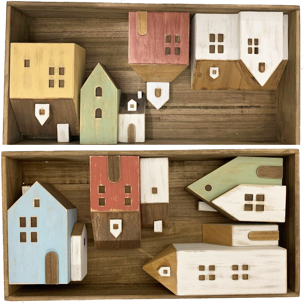 This set features 10 pieces (8 houses and 2 wooden storage boxes that form the Quay)