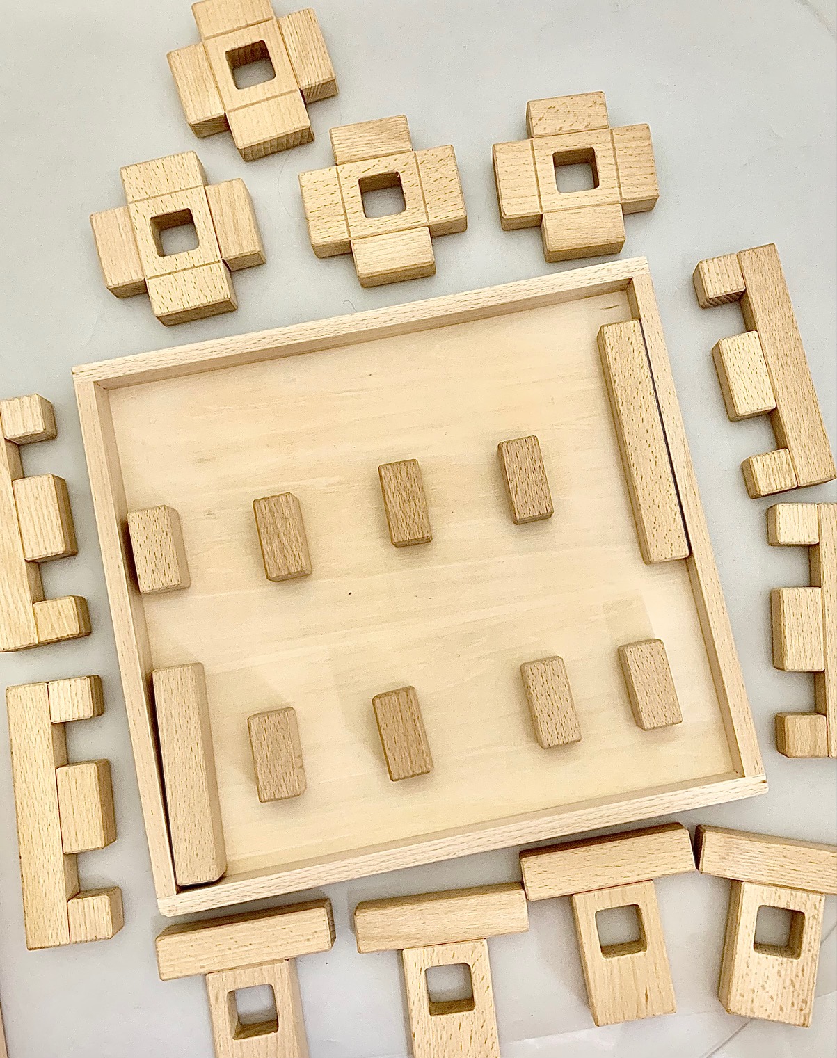 This 22 piece wooden Hashtag extender set contains 3 interesting shapes that work perfectly with the hashtags: A "kimono" shape, a "cross" shape and a "comb" shape and some loose parts in odd shapes.