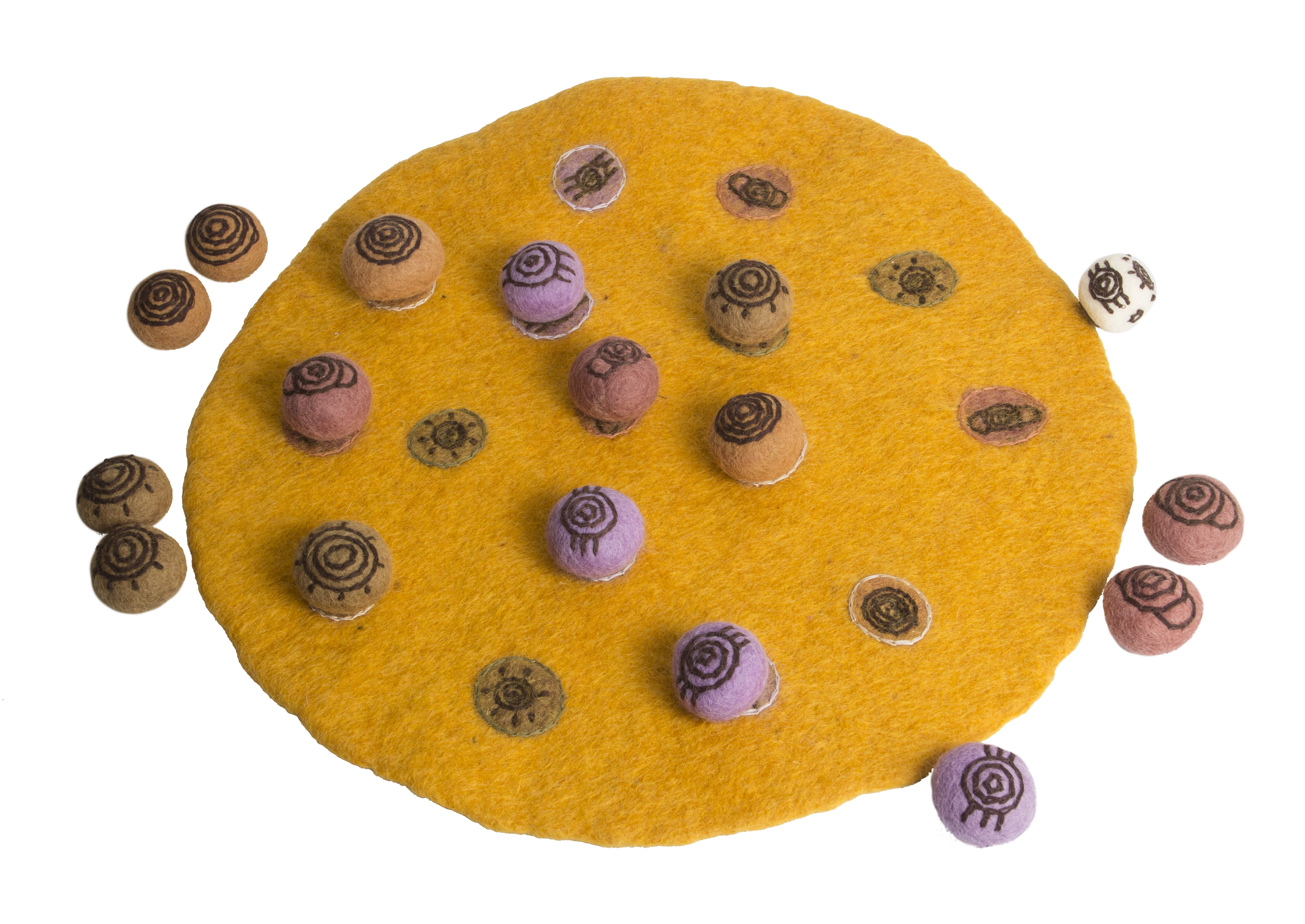 - 16 felt game pieces (4cm diameter), hand stitched with Indigenous symbols: Star, Water Hole, Meeting Place, and People Sitting Around Camp