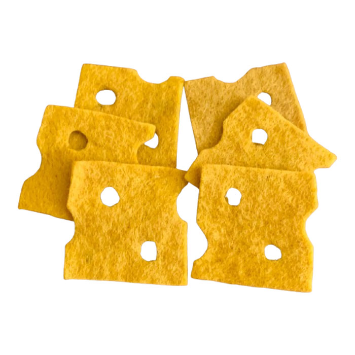 Product Description Wool felt pretend food - Jarlsberg Cheese slices Each piece - 6.5cm x 7cm x 0.5cm 6 pieces per set