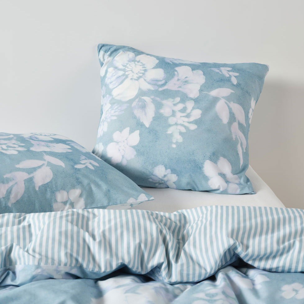 Complete your bedroom styling with the Linen House Kayla European Pillowcase. Hand‑painted in watercolour, Kayla exudes delicate romanticism with her classic floral expression. Made from crisp cotton percale, this statement hydrangea‑blue hue instils tranquillity and charm, and looks superb adorned as a pair with its matching quilt cover set.