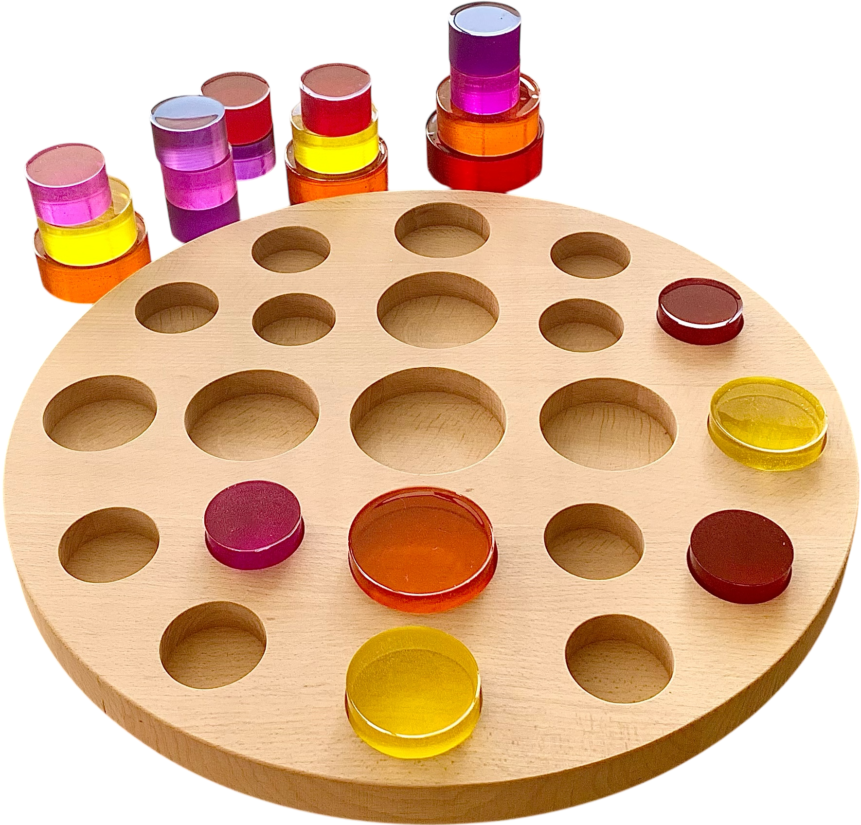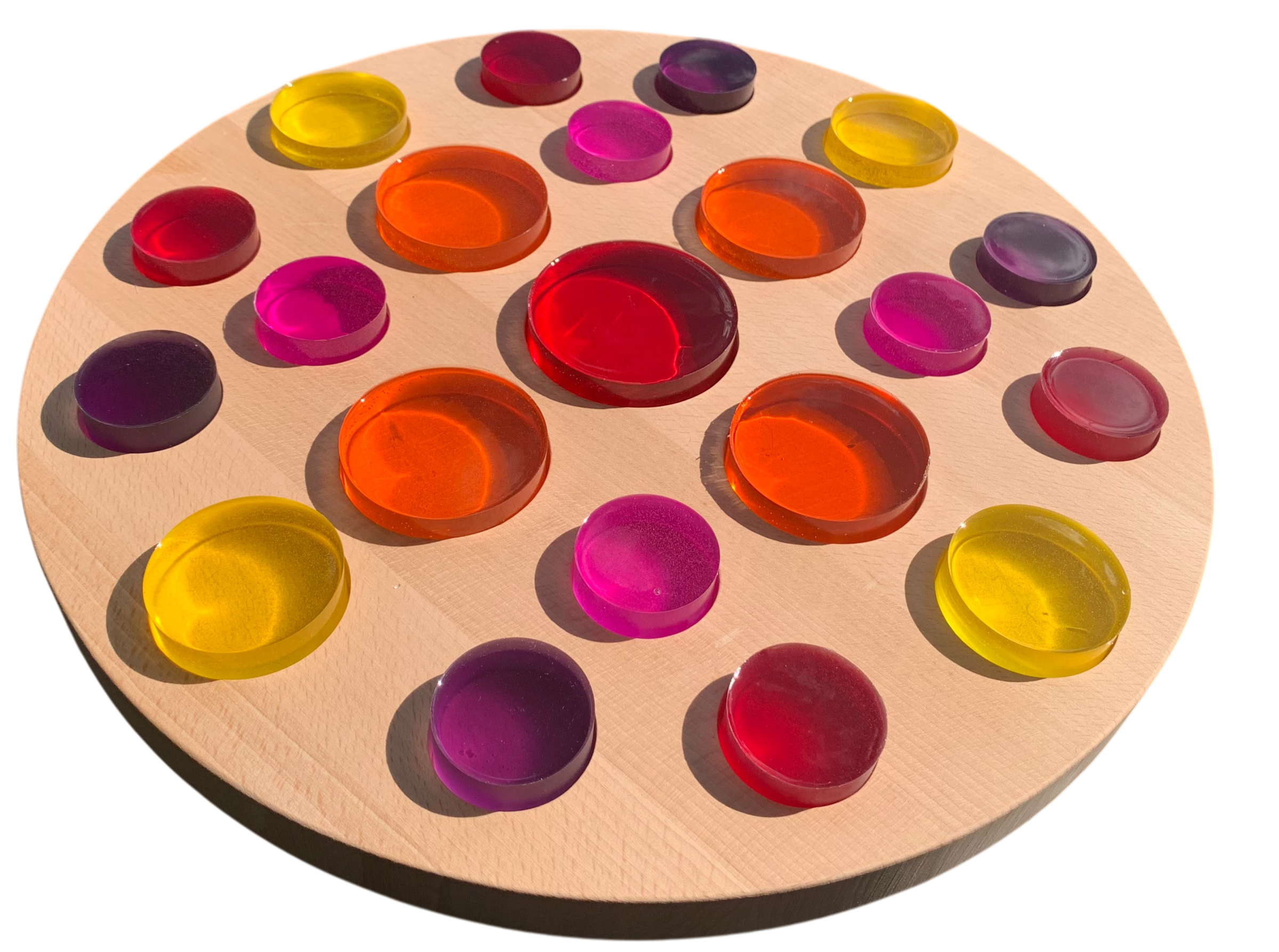 Children can stack, sort, and arrange the discs to explore patterns, colour mixing, and spatial relationships. Their smooth finish and radiant colours make them a tactile and visual delight.