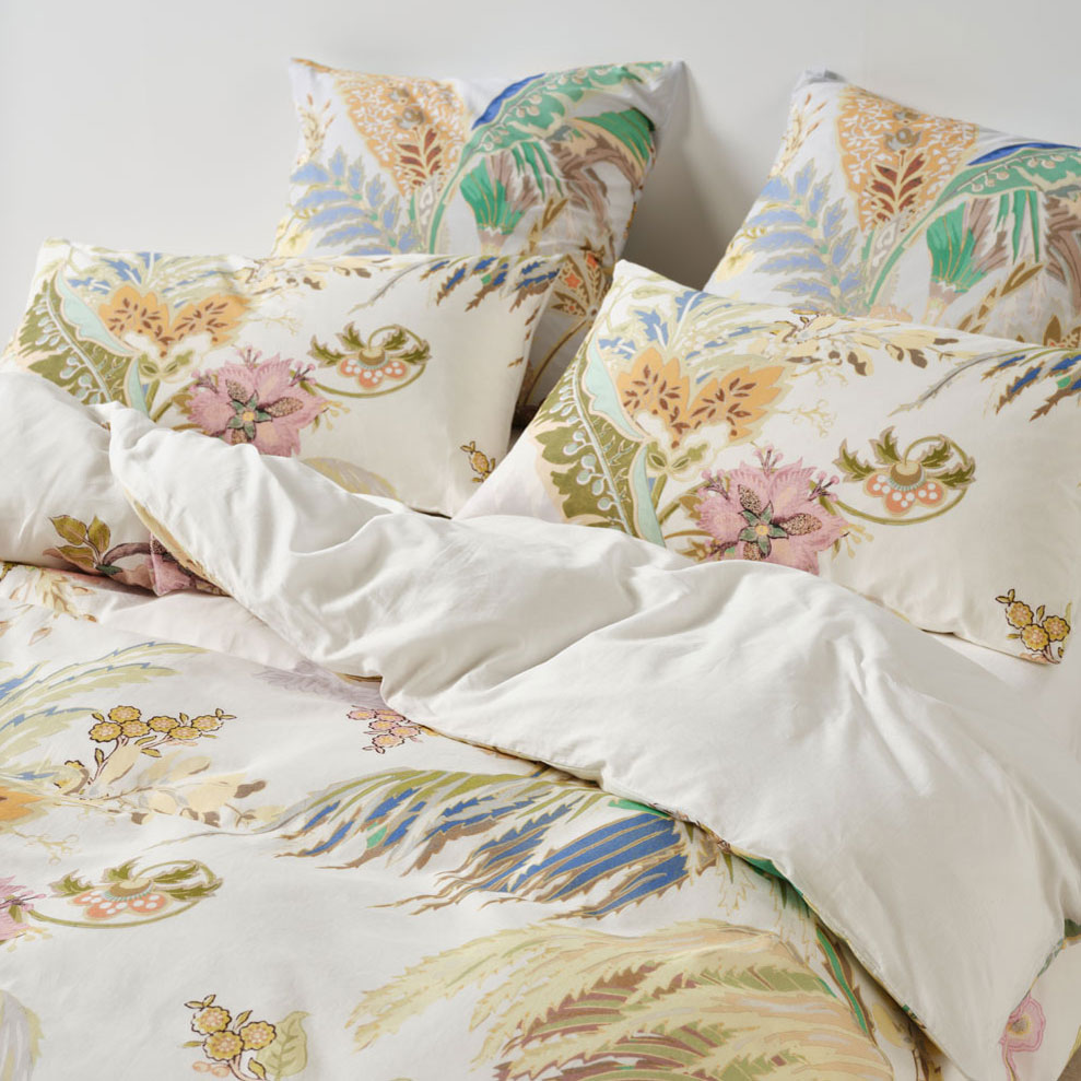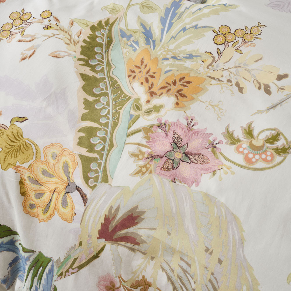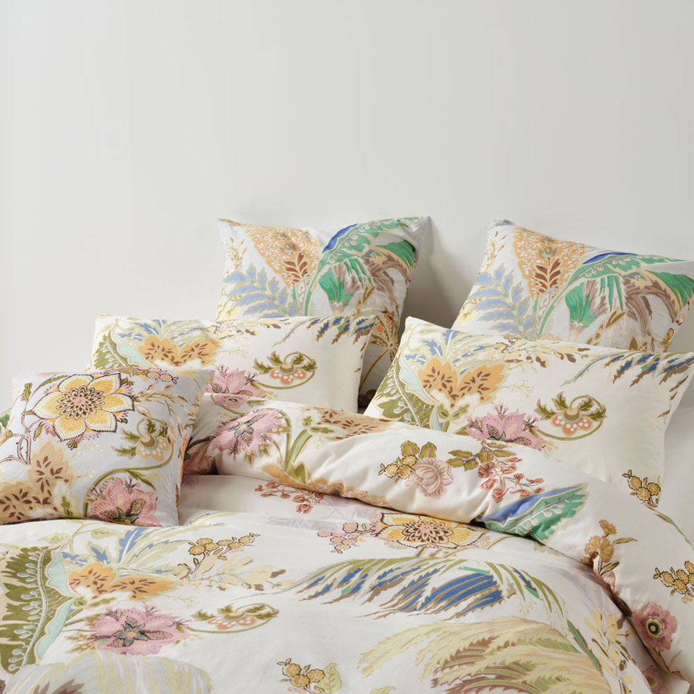 Transform your bedroom with the Linen House Larissa Quilt Cover Set. A feast of glorious colour, Larissa’s tropical‑meets‑chintz aesthetic mimics the charm of classic wallpaper design. Printed across soft white cotton voile, this vibrant palette of greens, sky‑blues, honey, and rose delivers luxe summer sleep‑ins with effortless style. Complete the look by pairing Larissa with its matching European pillowcases and cushion.