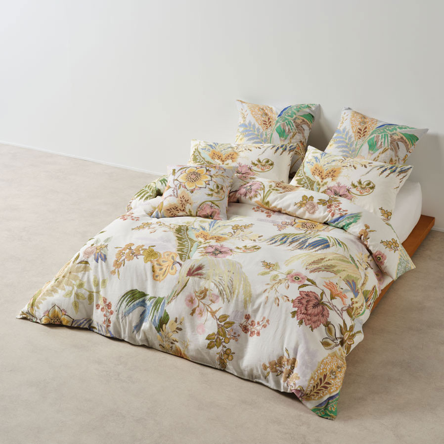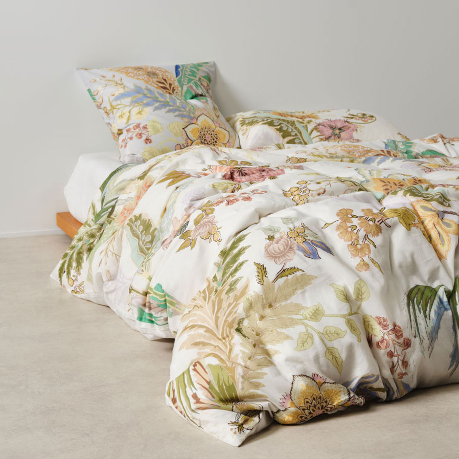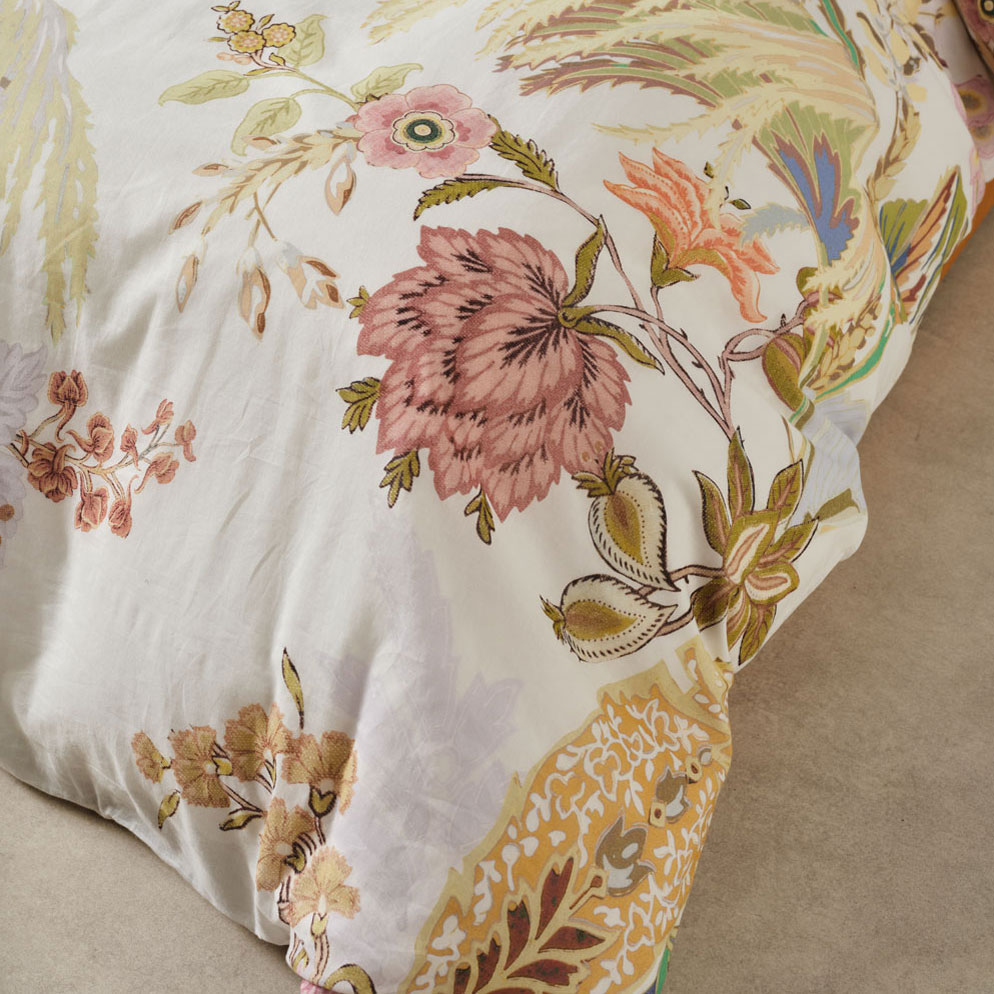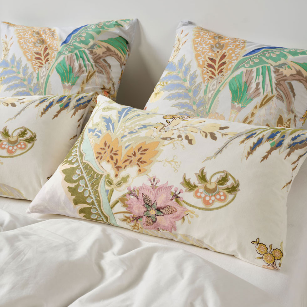 Transform your bedroom with the Linen House Larissa Quilt Cover Set. A feast of glorious colour, Larissa’s tropical‑meets‑chintz aesthetic mimics the charm of classic wallpaper design. Printed across soft white cotton voile, this vibrant palette of greens, sky‑blues, honey, and rose delivers luxe summer sleep‑ins with effortless style. Complete the look by pairing Larissa with its matching European pillowcases and cushion.