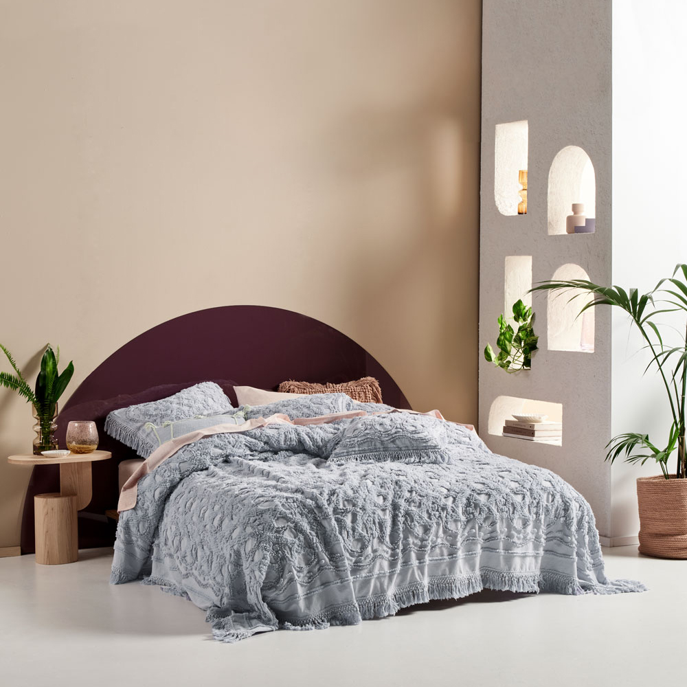 Beautifully nostalgic and intricate, this bed cover in a serene sky-blue is made from detailed cotton chenille and features tasseled fringes