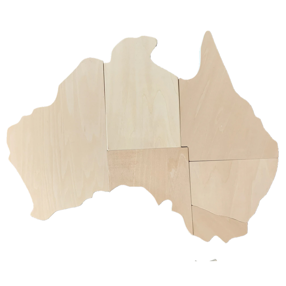 This giant map of Australia spans 50cm from left to right and is made from 10mm thick ply wood. There are 7 pieces to the set (Note: The ACT is included in NSW of course).