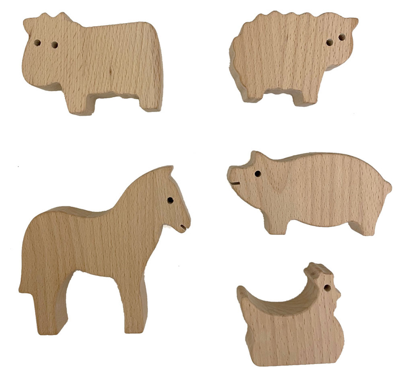 A fabulous set of 5 common farm life animals in natural beech wood. The set includes a cow, sheep, pig, chicken and a horse.