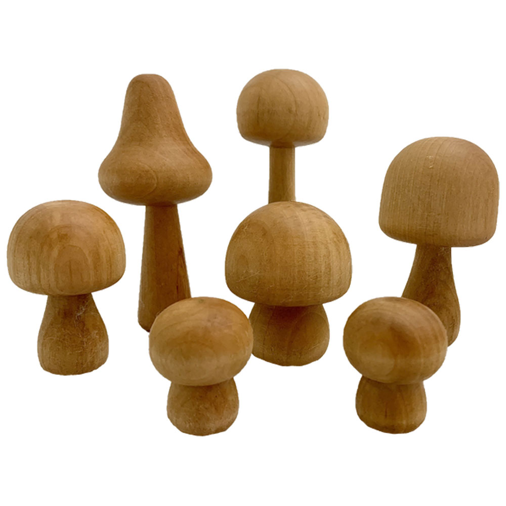 Set of 7 wooden mushrooms left natural are a great addition to Fairy World Play