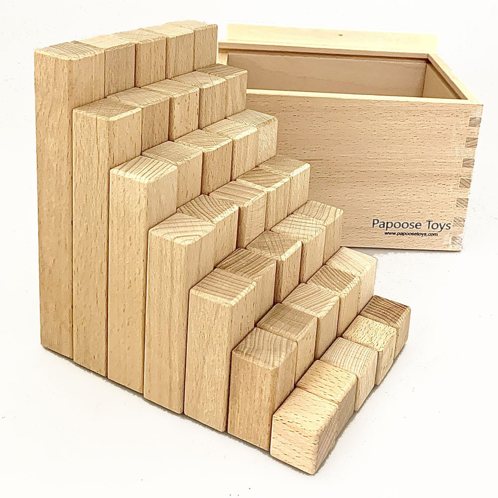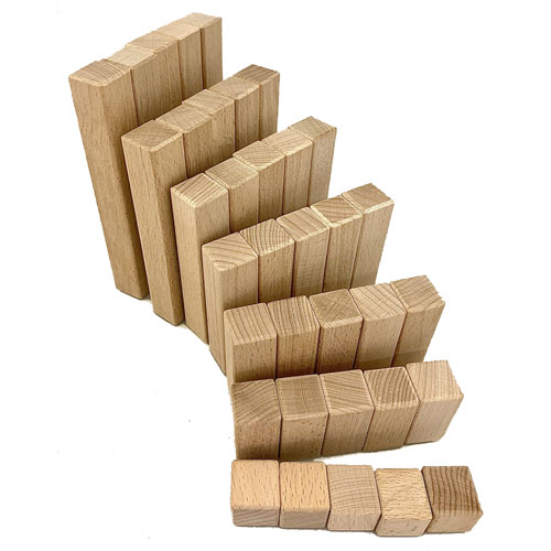 This set of stepped blocks left natural feature 7 sizes in increments of 2.5cm and there are 5 rods of each size.
