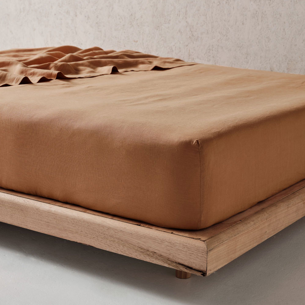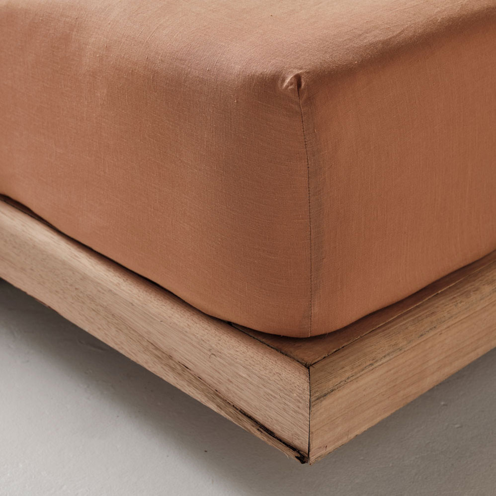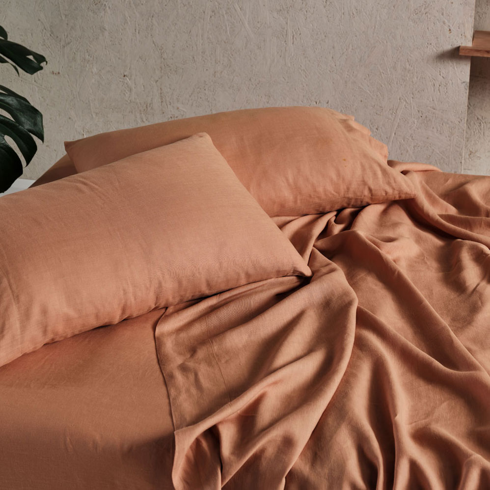 The Clay colourway evokes warmth and natural texture, pairing beautifully with neutral tones or deeper accents. Pre-shrunk and designed to soften with every wash, this linen sheet set is more durable than cotton, launders effortlessly, and requires little to no ironing.