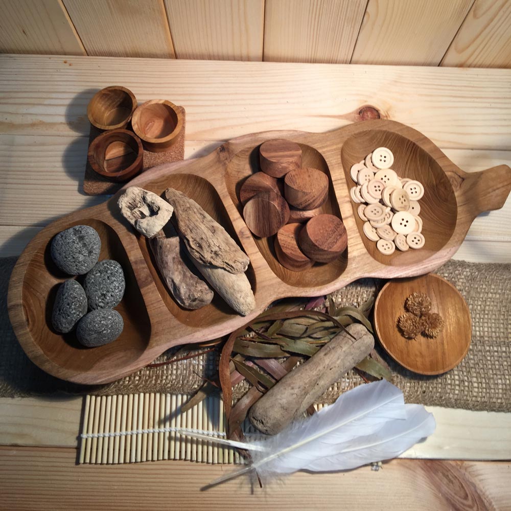This tamarind sorting bowl can be used for open ended play, decorative purposes or for food. Children naturally enjoy sorting objects by colour, size or type making this four section wooden bowl perfect as a playroom accessory to assist in counting and classifying. Add some loose parts such as wool felt balls or natural materials like wood, shells etc.