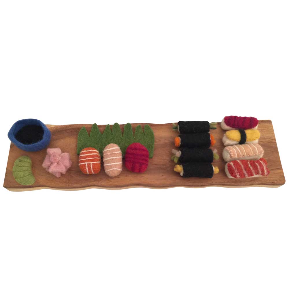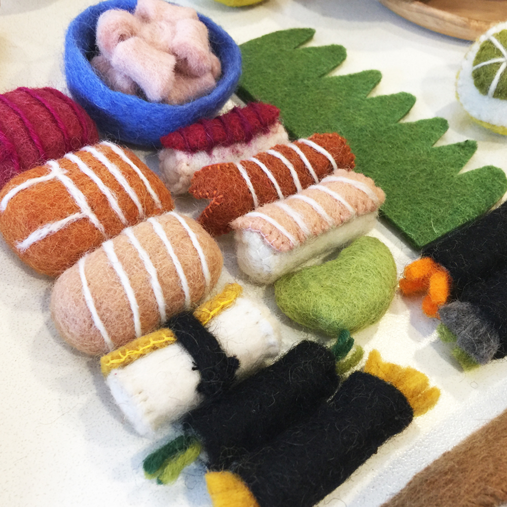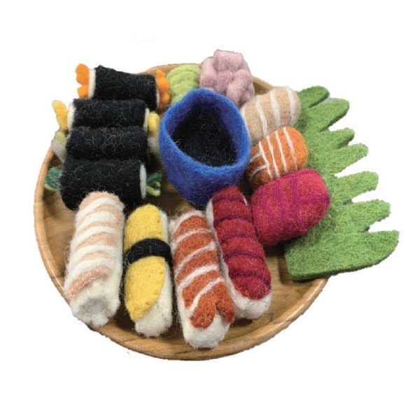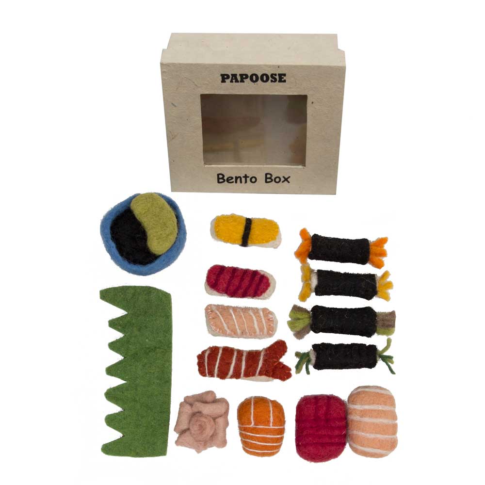 Bento Box 15 piece boxed set - Made from 100% wool, dyed with non-toxic colourfast dyes, all hand-stitched, these original hand felted products are sure to please little kids and big kids alike. The Bento Box set is served on a plate from the Teak Place Setting available separately.