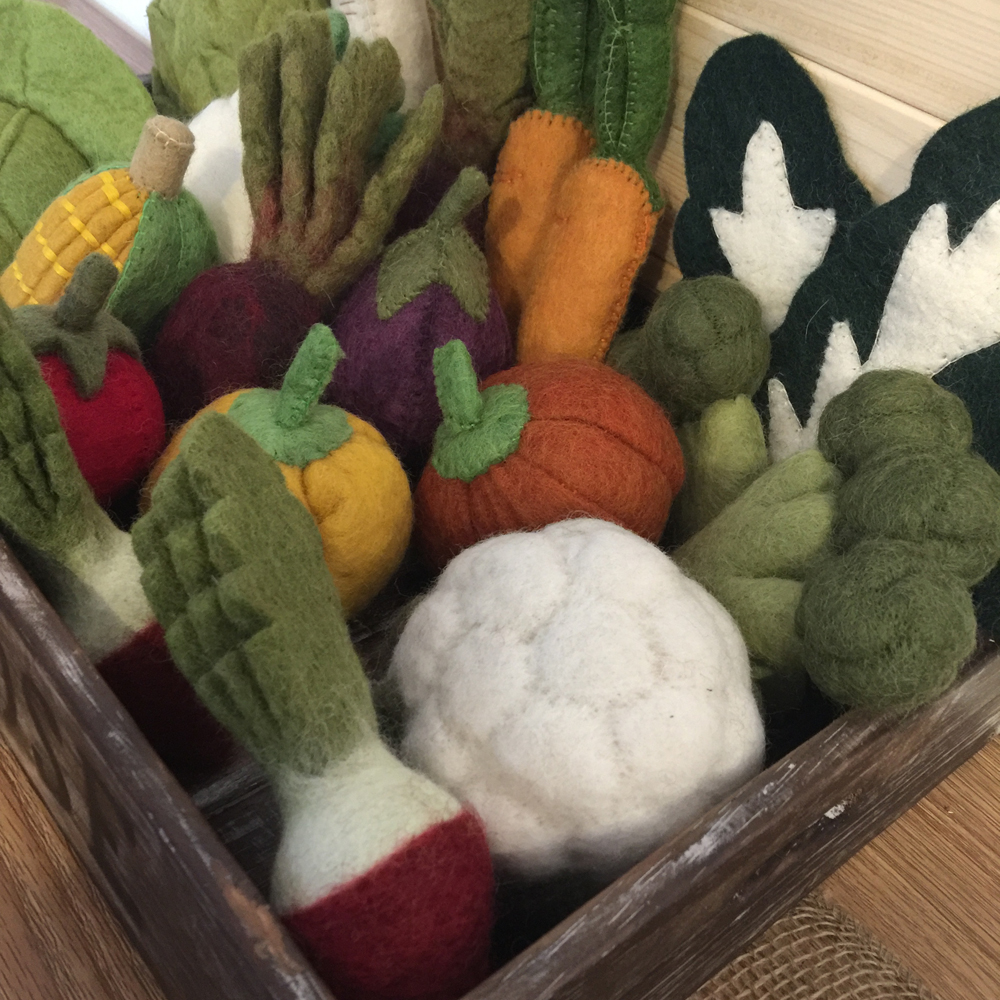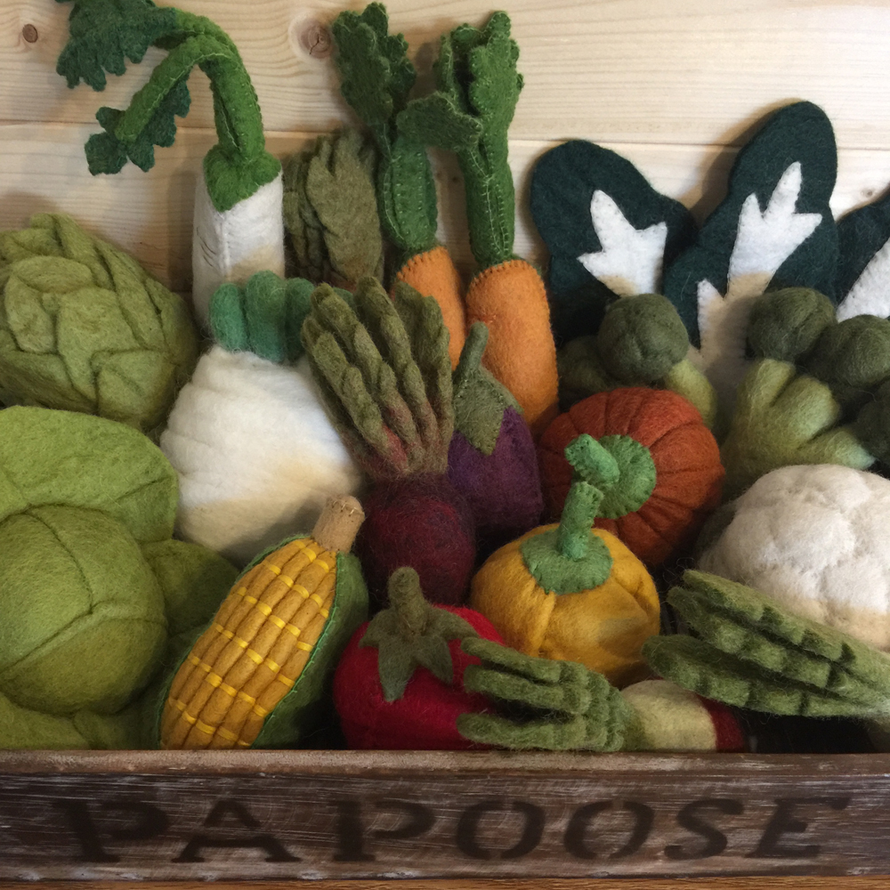 This set of crated vegetables contains 20 pieces of assorted wool felt vegetables in a generously sized wooden crate 35x55x7cm. The set contains a selection of vegetables including corn, broccoli, carrots, leeks, spinach, lettuce, cauliflower, fennel, eggplant, artichoke, beetroot and radish