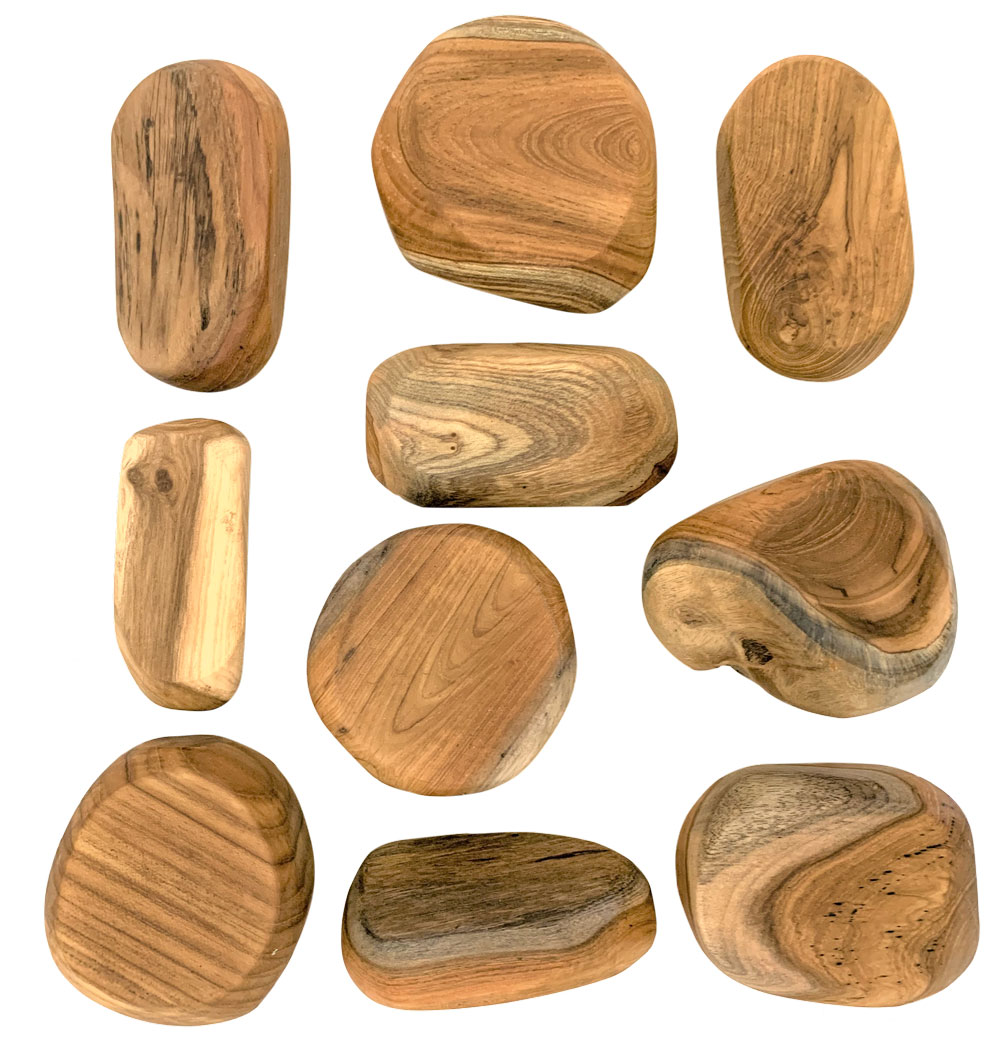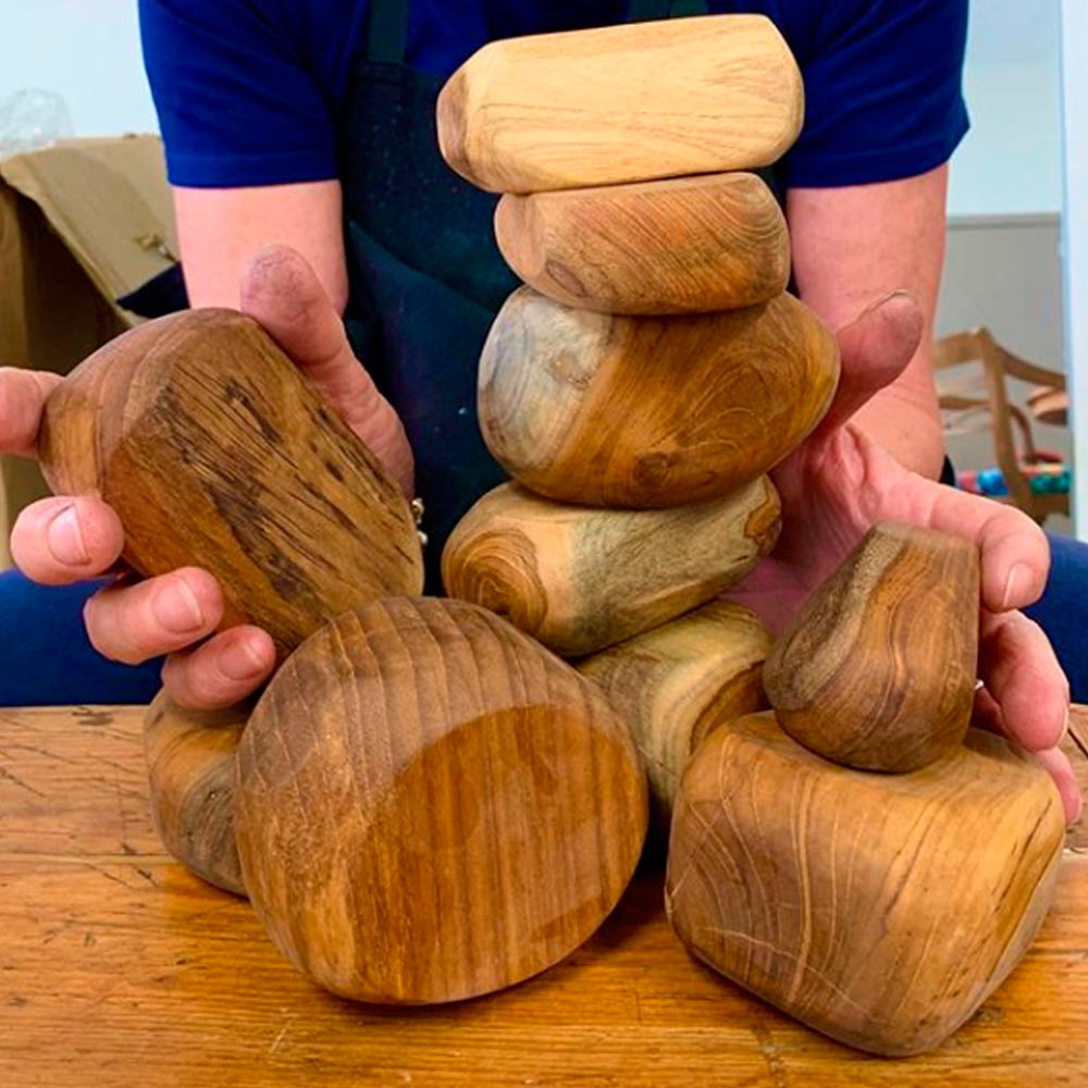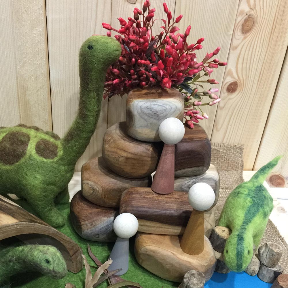 These open-ended chunky Flintstone stacking rocks are made utilising waste material from the furniture industry! Using a natural finish to bring out the colour and grain in the wood. Each piece is different and can be stacked. The wood colour, wood grain and sizes vary making each piece unique.