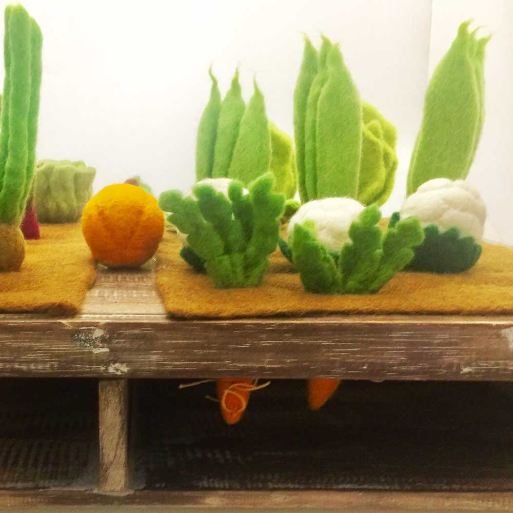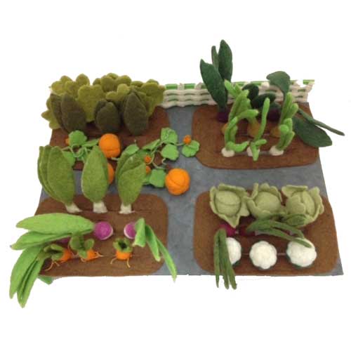 Grow a Garden consists of 36 pieces of mini Felt vegetables. There a 3 pieces each of 12 different vegetables, lettuce,pumpkin,red onion, cauliflower, white radish, brown onion, turnip,, garlic, carrot, beetroot, cabbage and red radish. Look underneath to see the vegetables that grow under the soil and those that grow above ground - Made from 100% wool, dyed with non-toxic colourfast dyes, all hand-stitched, these original hand felted products are sure to please little kids and big kids alike.