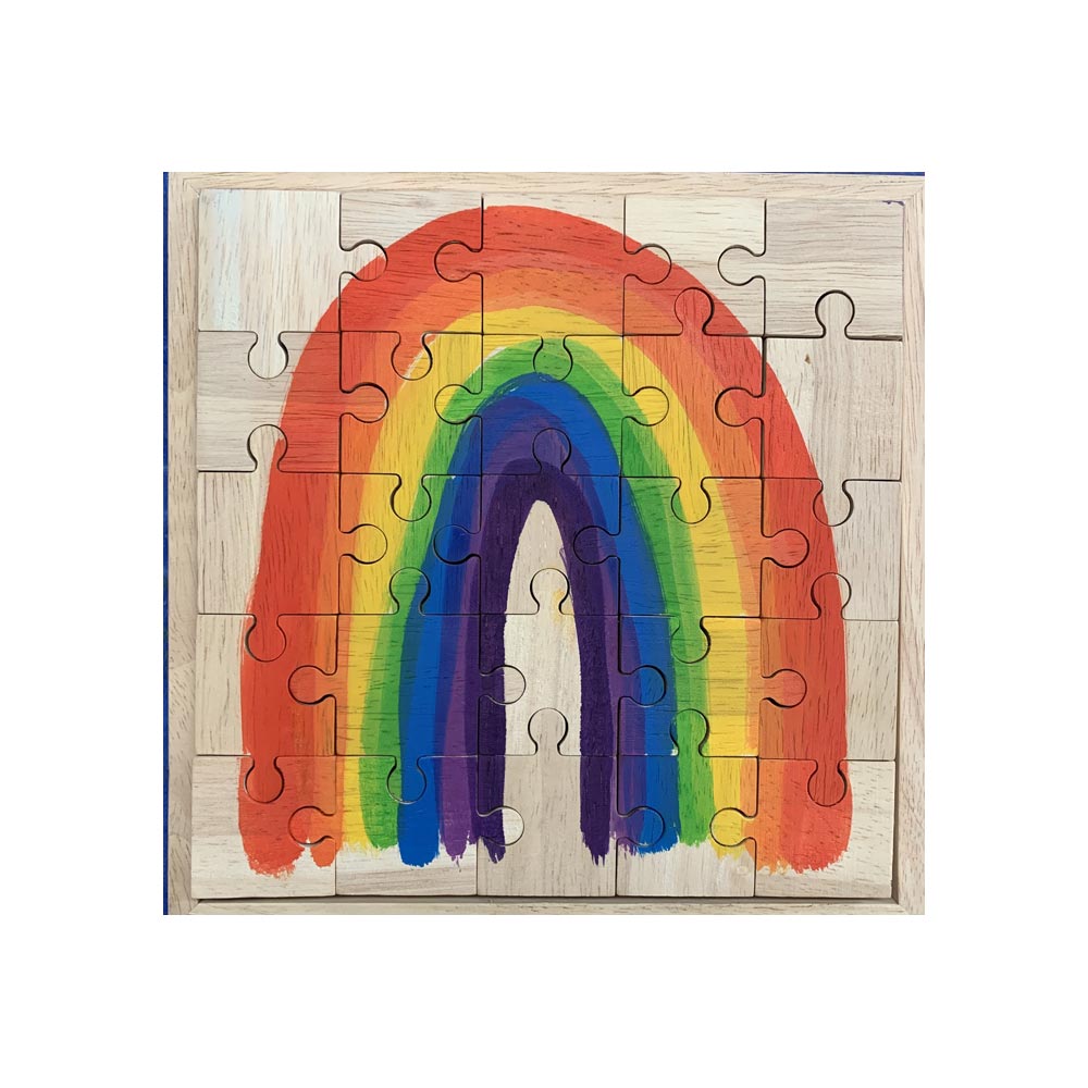 This wonderful 25 piece chunky wooden jigsaw puzzle featuring a bright rainbow arch has been hand painted by designer Renske Carbone in her Melbourne studio using high quality german dyes. The front of each puzzle has been hand painted and the reverse left blank for a more challenging experience. Each puzzle sits neatly in the included wooden tray ideal for storage or moving your uncompleted jigsaw puzzle to a new location for when you are ready to continue playing .
