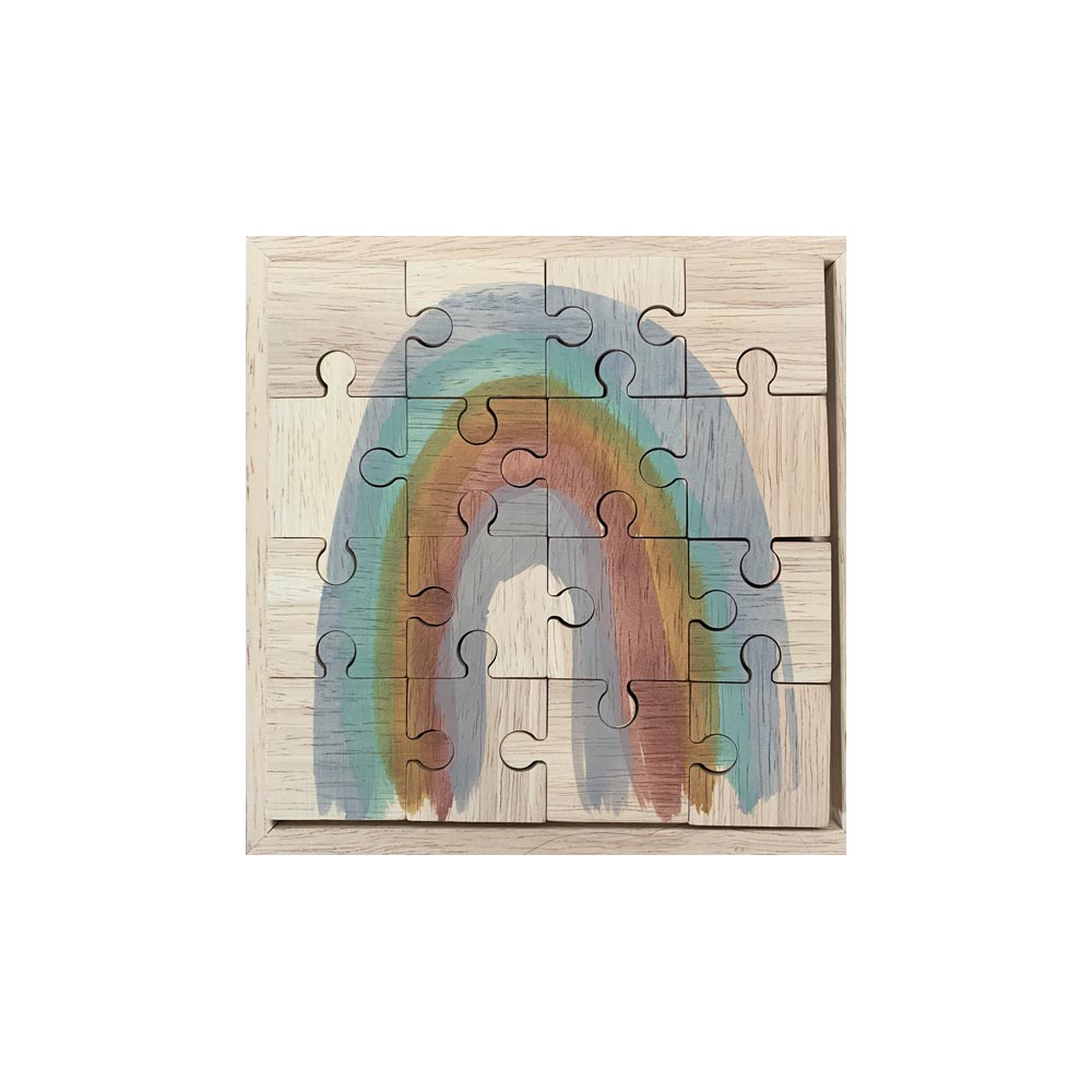 This wonderful 16 piece chunky wooden jigsaw puzzle featuring an Earth coloured rainbow arch has been hand painted by designer Renske Carbone in her Melbourne studio using high quality german dyes. The front of each puzzle has been hand painted and the reverse left blank for a more challenging experience. Each puzzle sits neatly in the included wooden tray ideal for storage or moving your uncompleted jigsaw puzzle to a new location for when you are ready to continue playing .