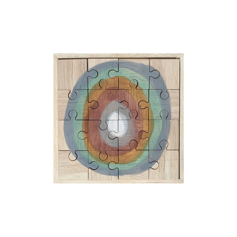 This wonderful 16 piece chunky wooden jigsaw puzzle featuring an Earth coloured rainbow moon has been hand painted by designer Renske Carbone in her Melbourne studio using high quality german dyes. The front of each puzzle has been hand painted and the reverse left blank for a more challenging experience. Each puzzle sits neatly in the included wooden tray ideal for storage or moving your uncompleted jigsaw puzzle to a new location for when you are ready to continue playing .