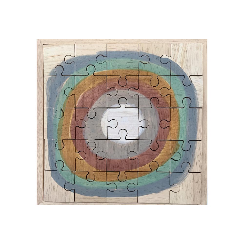 This wonderful 25 piece chunky wooden jigsaw puzzle featuring an Earth coloured rainbow moon has been hand painted by designer Renske Carbone in her Melbourne studio using high quality german dyes. The front of each puzzle has been hand painted and the reverse left blank for a more challenging experience. Each puzzle sits neatly in the included wooden tray ideal for storage or moving your uncompleted jigsaw puzzle to a new location for when you are ready to continue playing .