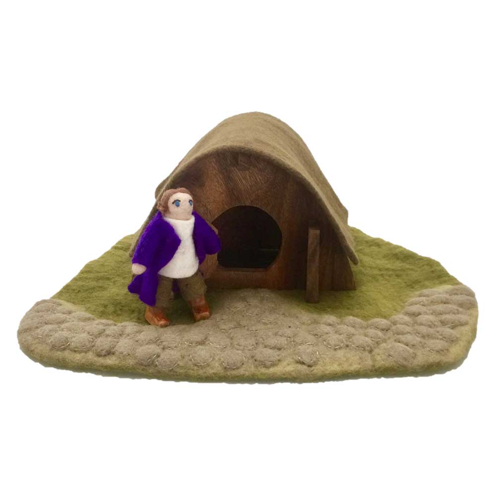 This fantastic wood and wool felt play set features a wool felt pebble path mat, Mr. Hobbit, Hobbit wooden house and Wool felt roof.