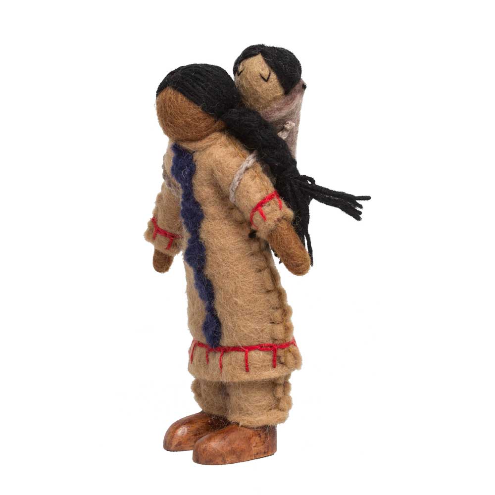This wonderful Native American Family features 5 dolls with the youngest member carried in a papoose on the mother's back. The mother and father measure approx 20cm tall and the children measure approx 13cm & 14cm. They all wear wooden shoes except the baby.