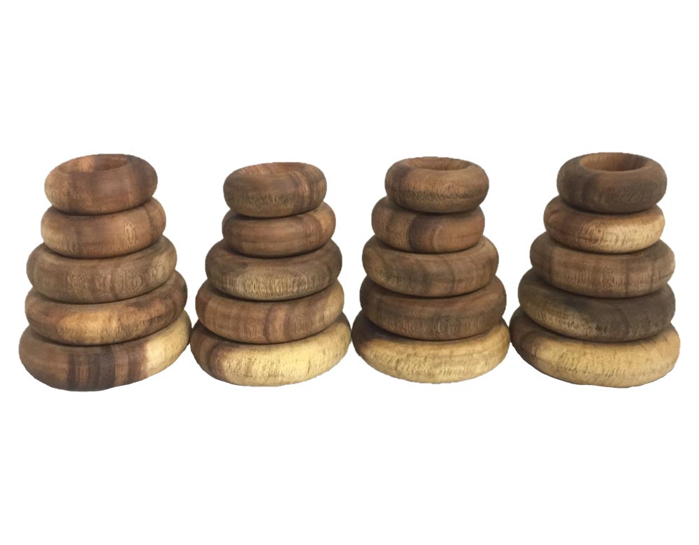 These Wooden Doughnuts are made from sustainably sourced Suar Wood. They are all natural and open ended toys that are beautiful in their own right! As each piece is made from natural wood there will be different colours and grains in each set. Each set contains 4 each size Xsmall, Small, Medium and Large
