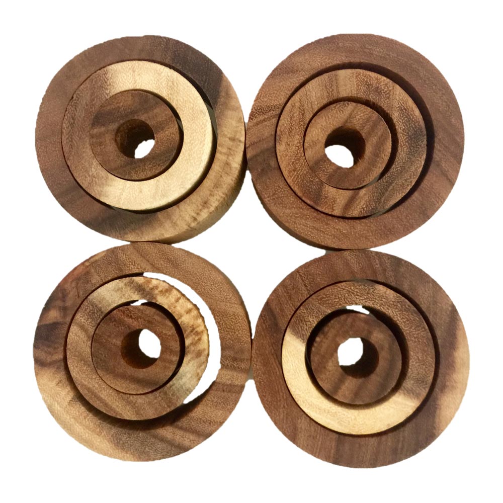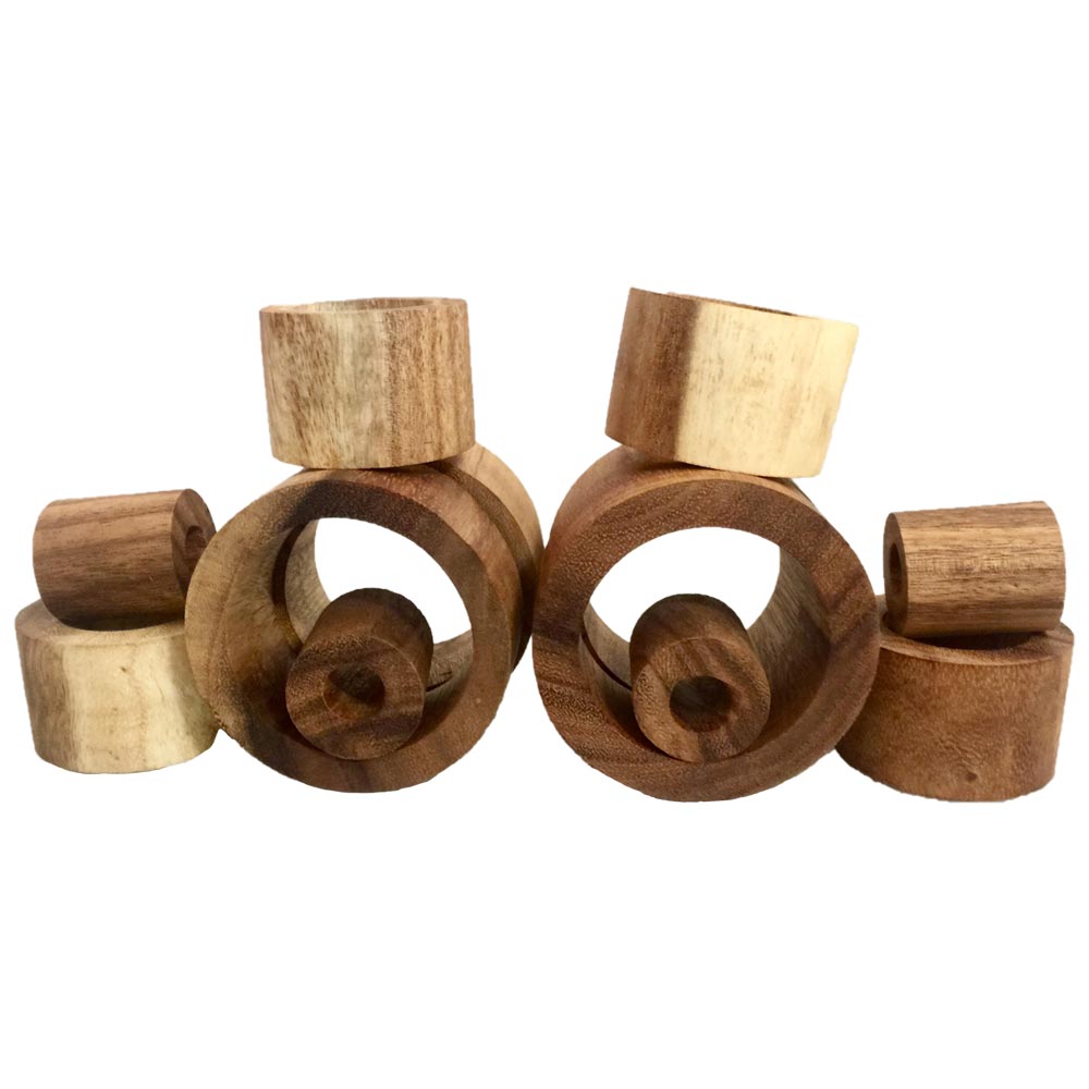 These Nested Tubes are made from sustainably sourced Suar Wood. As each piece is made from natural wood there will be different colours and grains in each set. The set consists of 4 Nested tube sets. 4 each size Small, Medium and Large. Height is approx. 4cm with diameters of 3.5cm, 6cm and 9cm.