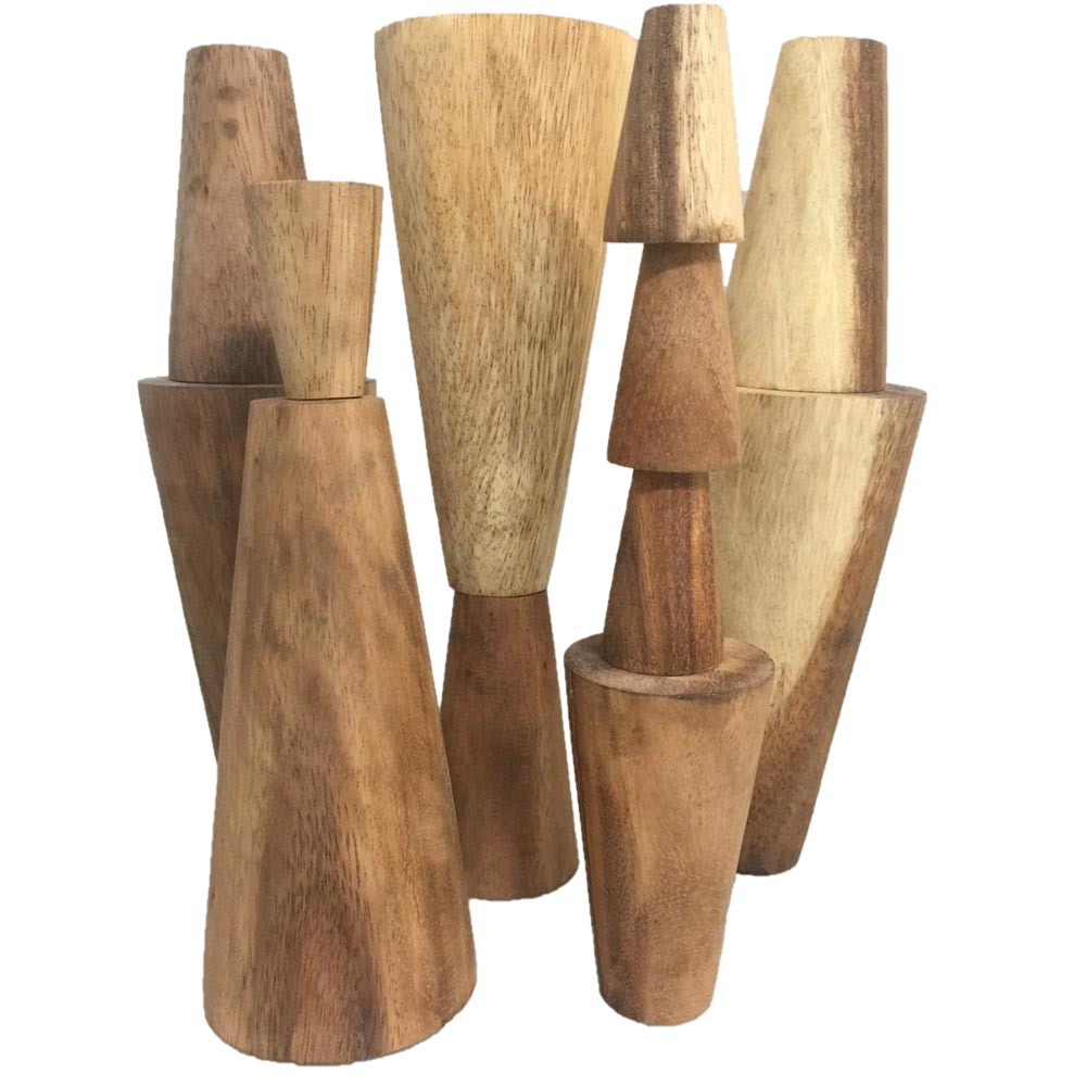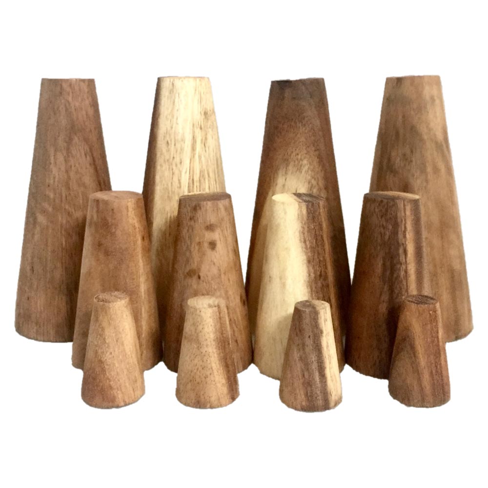 These stacking cones are made from sustainably sourced Suar Wood. They are all natural and open ended toys that are beautiful in their own right! As each piece is made from natural wood there will be different colours and grains in each set. Each set contains 4 each size Small, Medium and Large. HEIGHT Small 5cm Medium 9cm Large 15cm