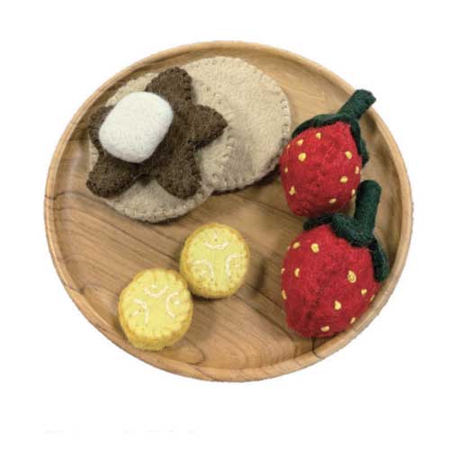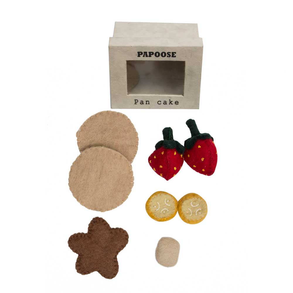 This Wool Felt Pancake Set includes 2 pancakes, maple syrup, dollop of butter/cream, 2 strawberries and 2 lemon wedges, packaged in a presentation box.