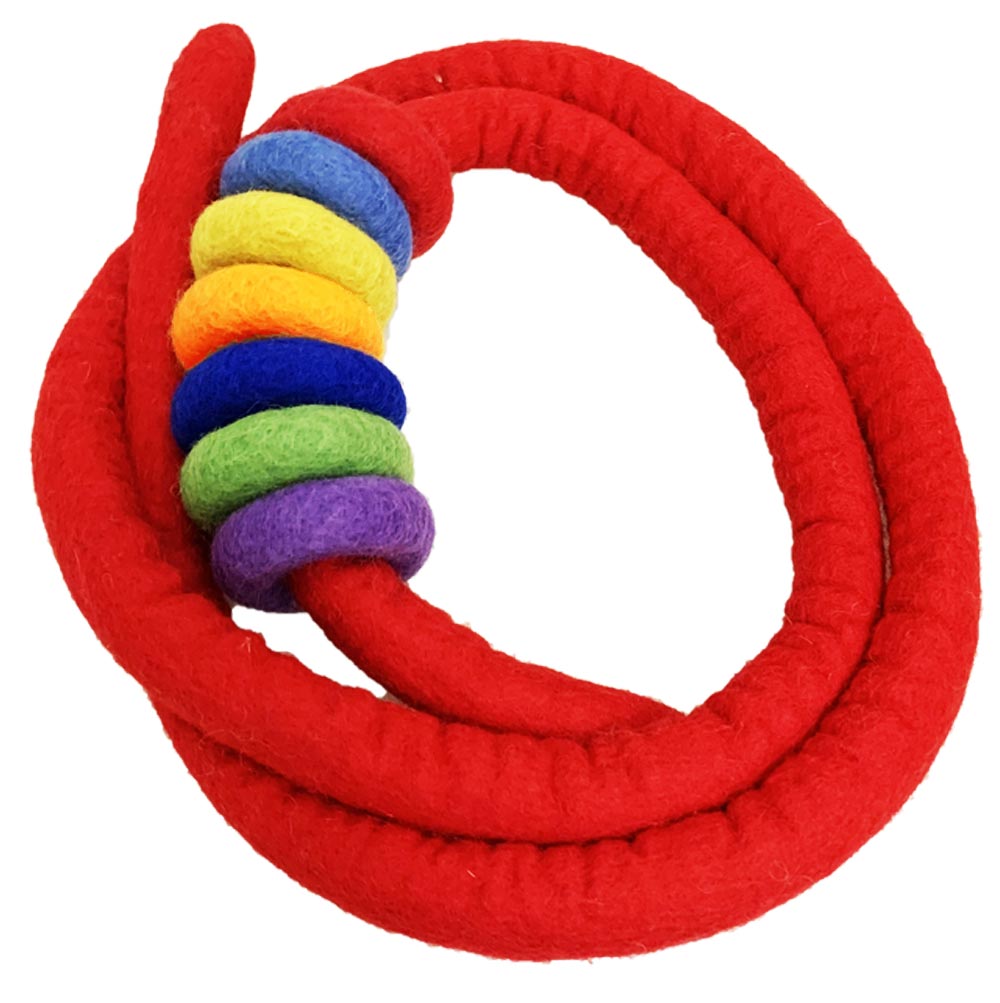 Product Description RED coloured felt rope with 7 mixed coloured doughnuts. Ropes measure 2 meters long. Great for stringing activities and making up games.