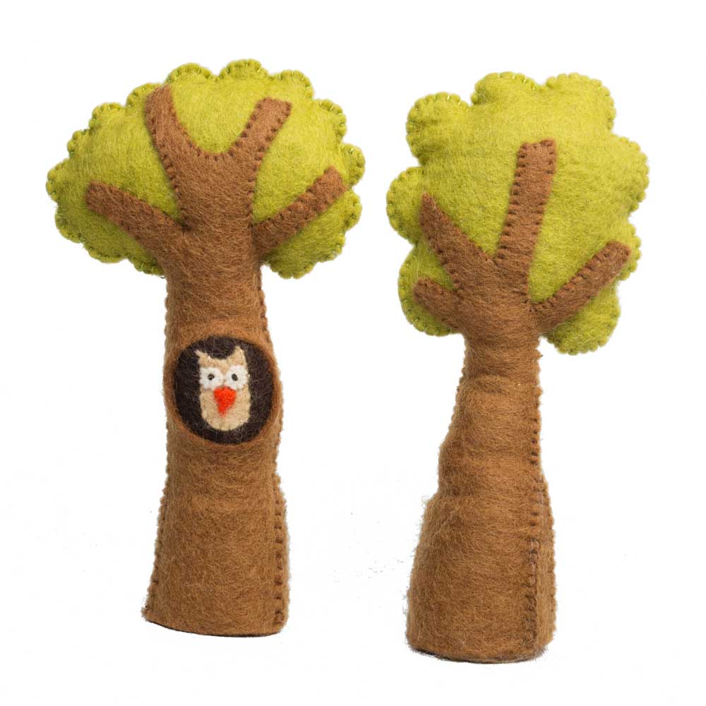 A set of 2 trees with one tree featuring an owl in the trunk. The solid wood bases are covered in felt for easy standing. Height 18cm